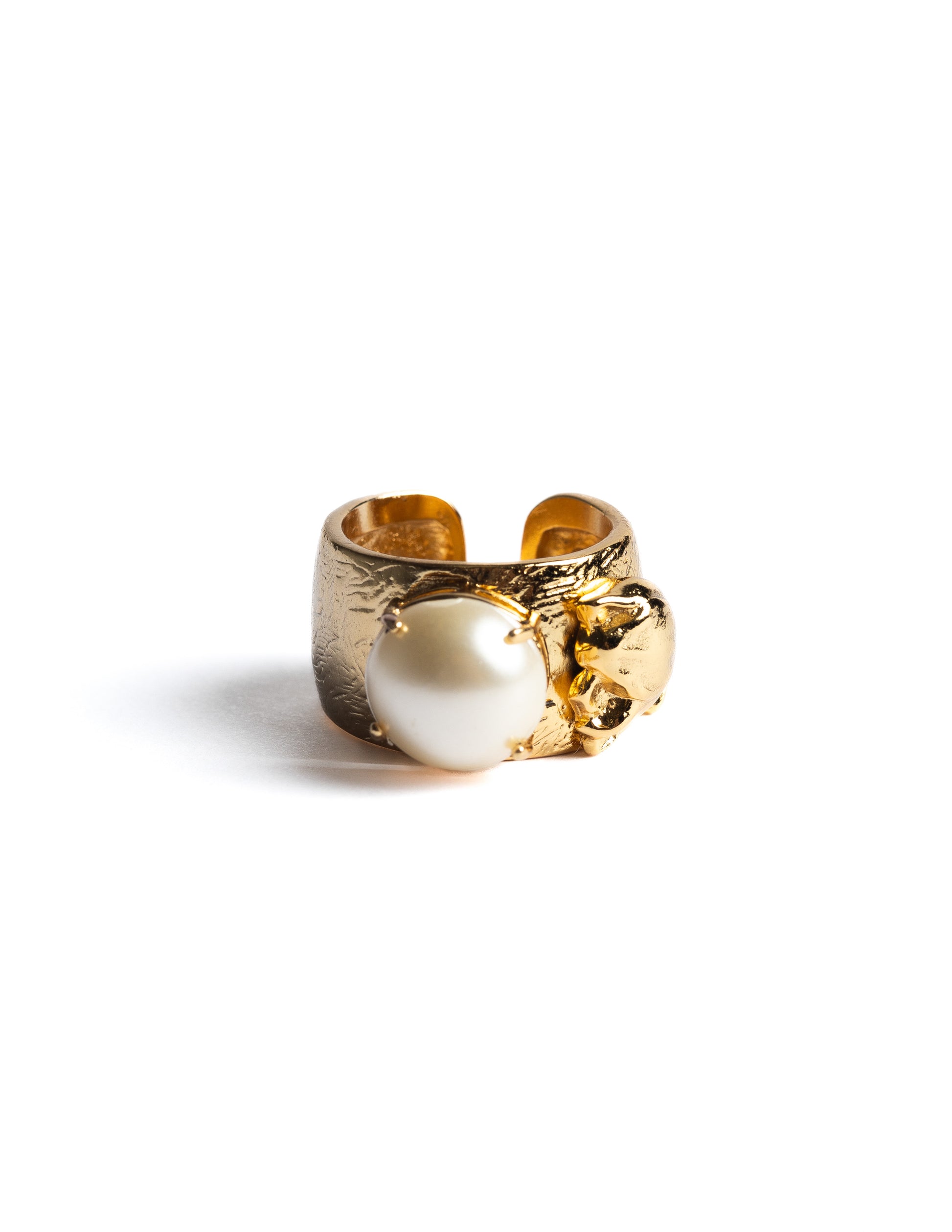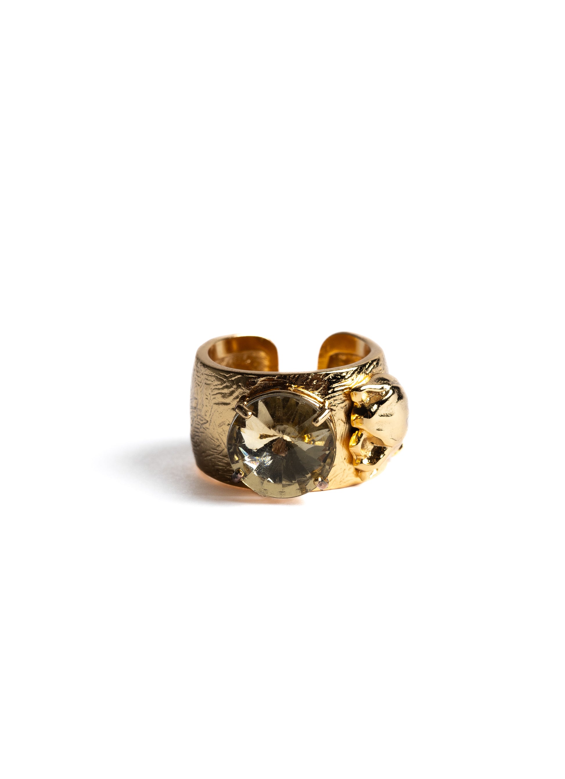 Anel ajustável, cravejado manualmente, com detalhe de flor de tulipa na lateral.