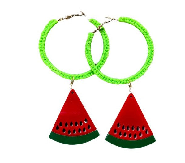 Brinco em metal banho ouro em argola macramê e pingente de melancia em acrílico com 10 cm de comprimento.