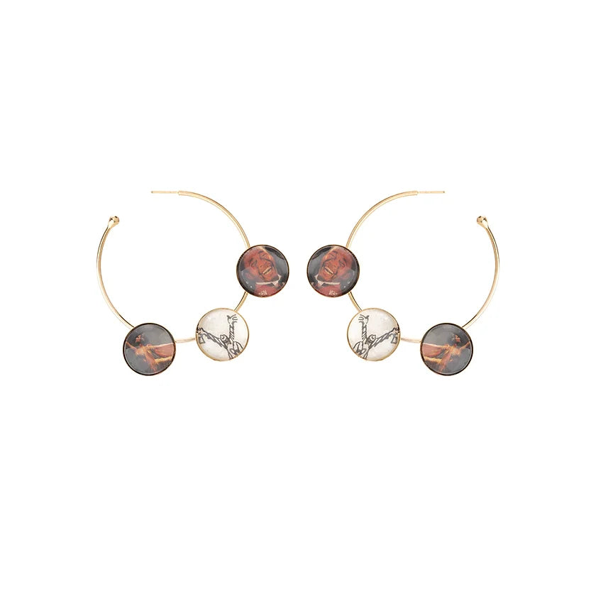 Brinco argola metal banho ouro vintage 18k com playbills da broadway em resina. Fechamento em pino.