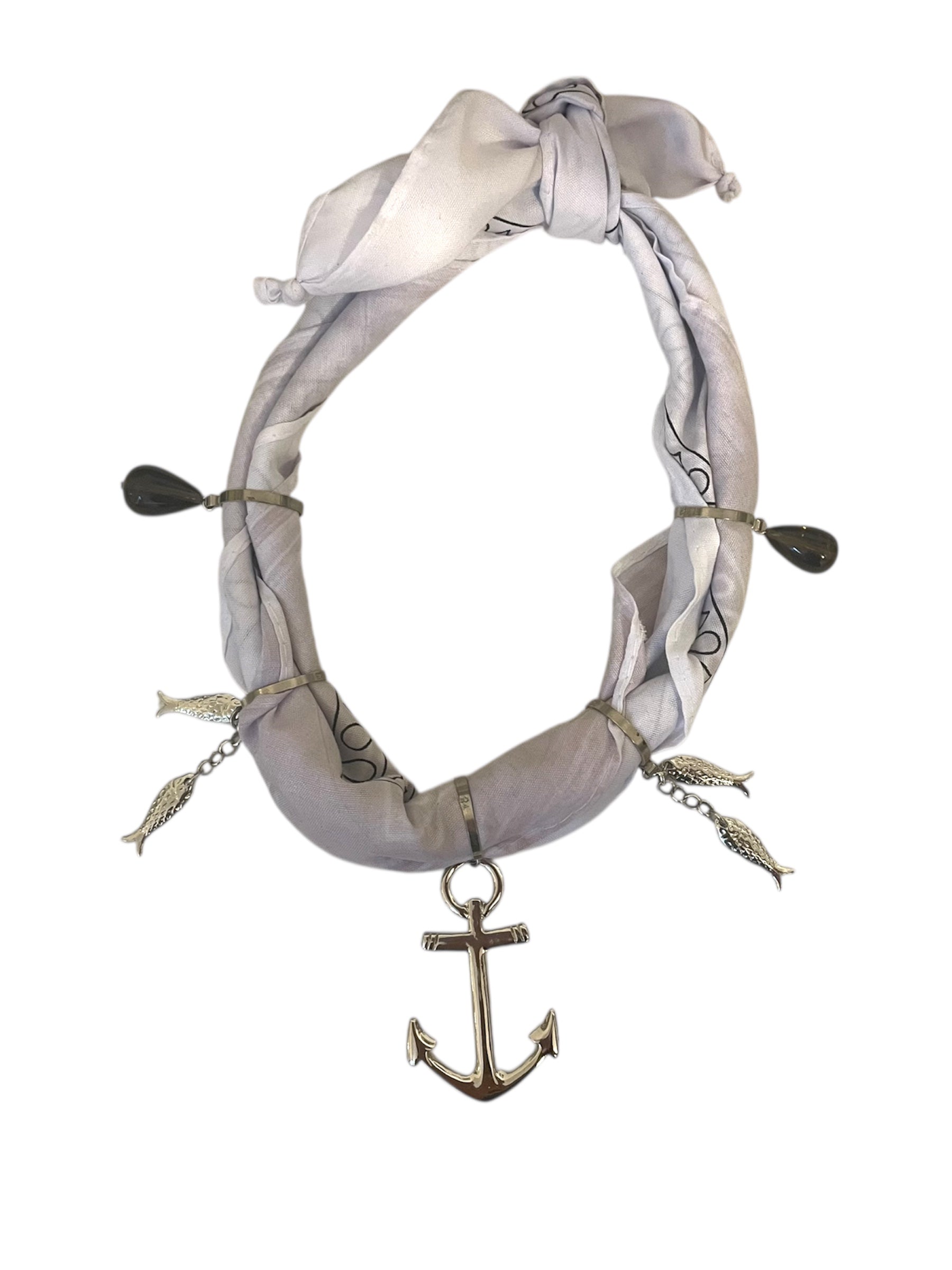 ou uma âncora central, dupla de sardinhas de metal e duas gotas de cristal espelhados.