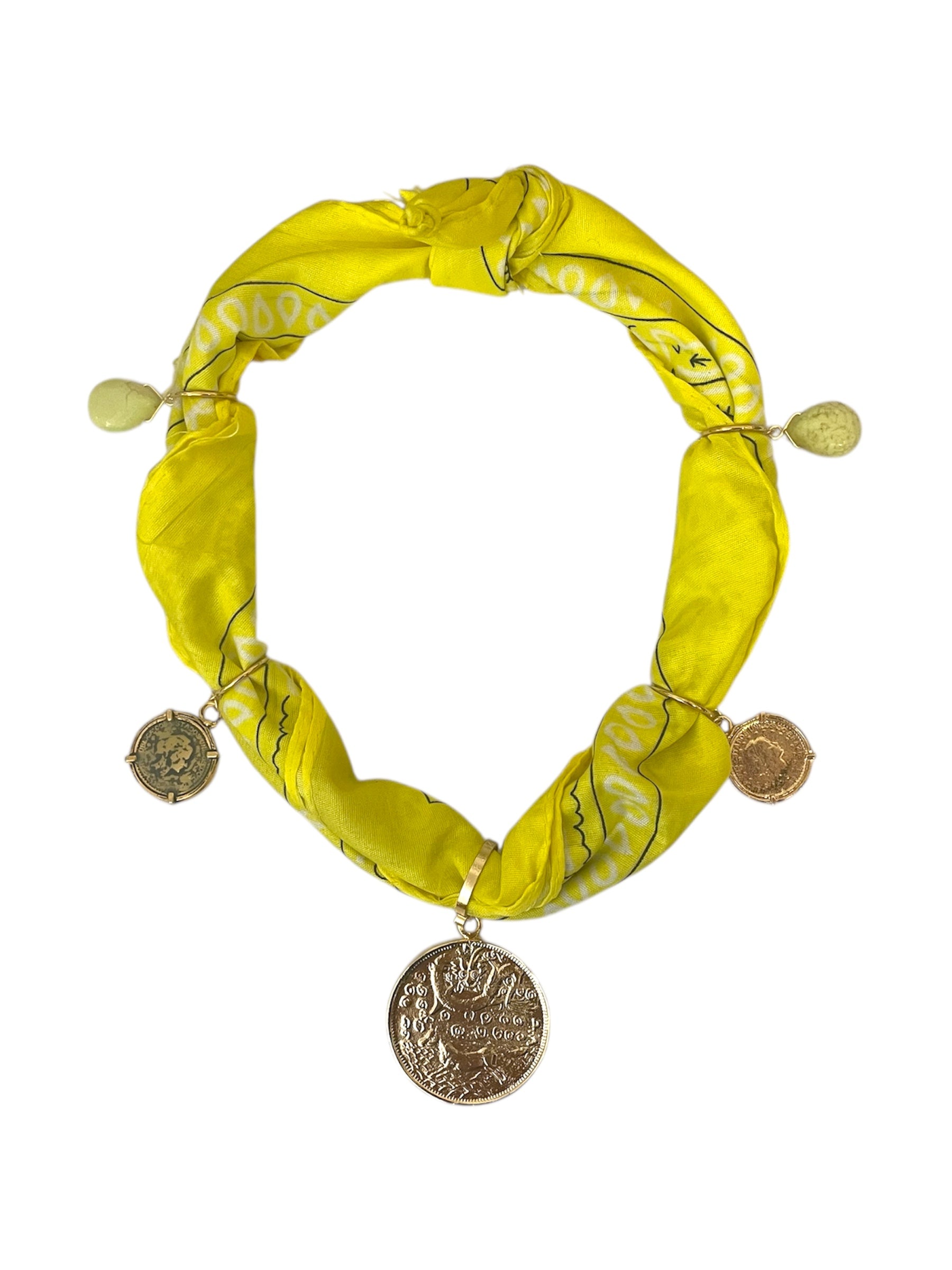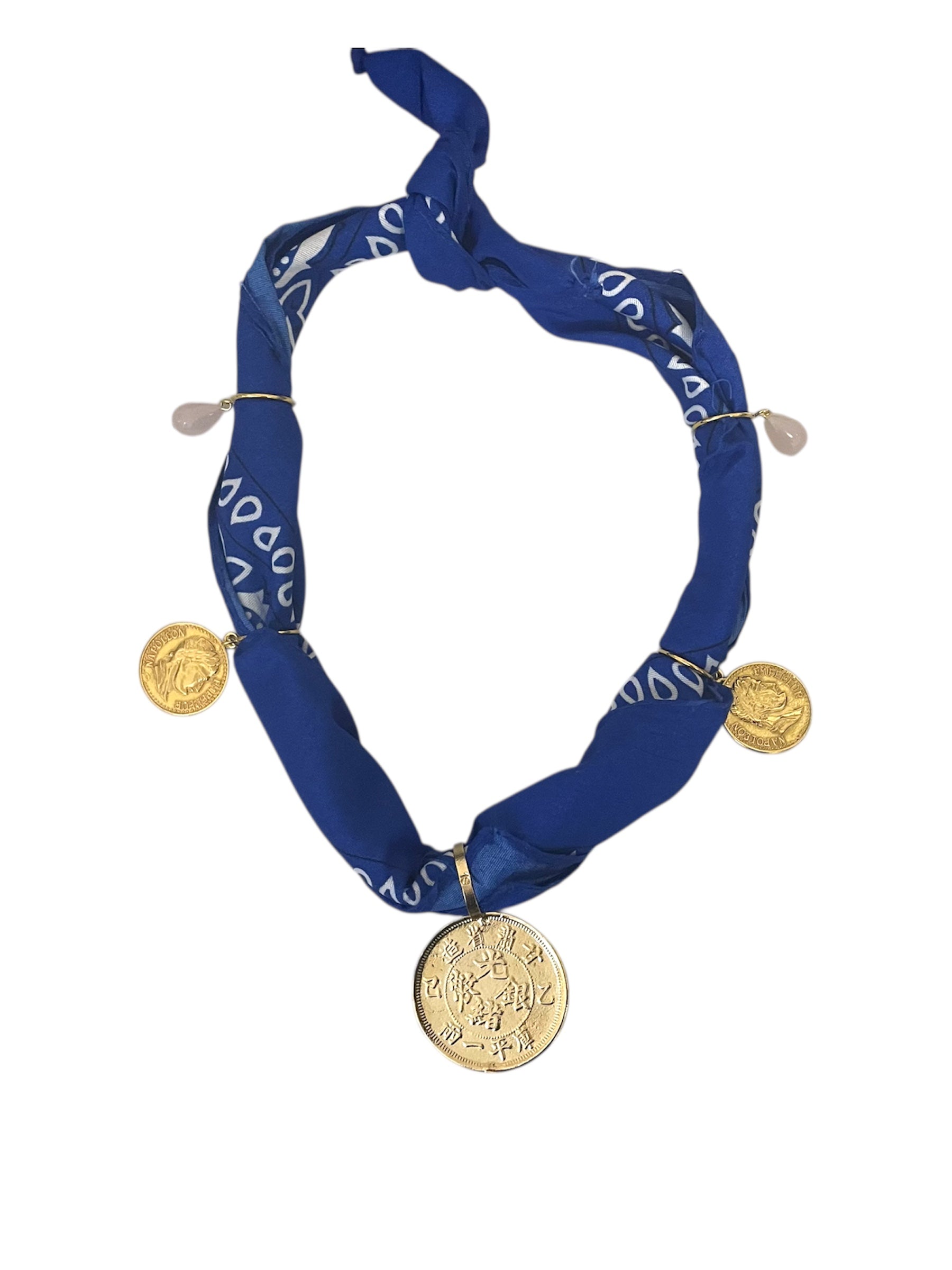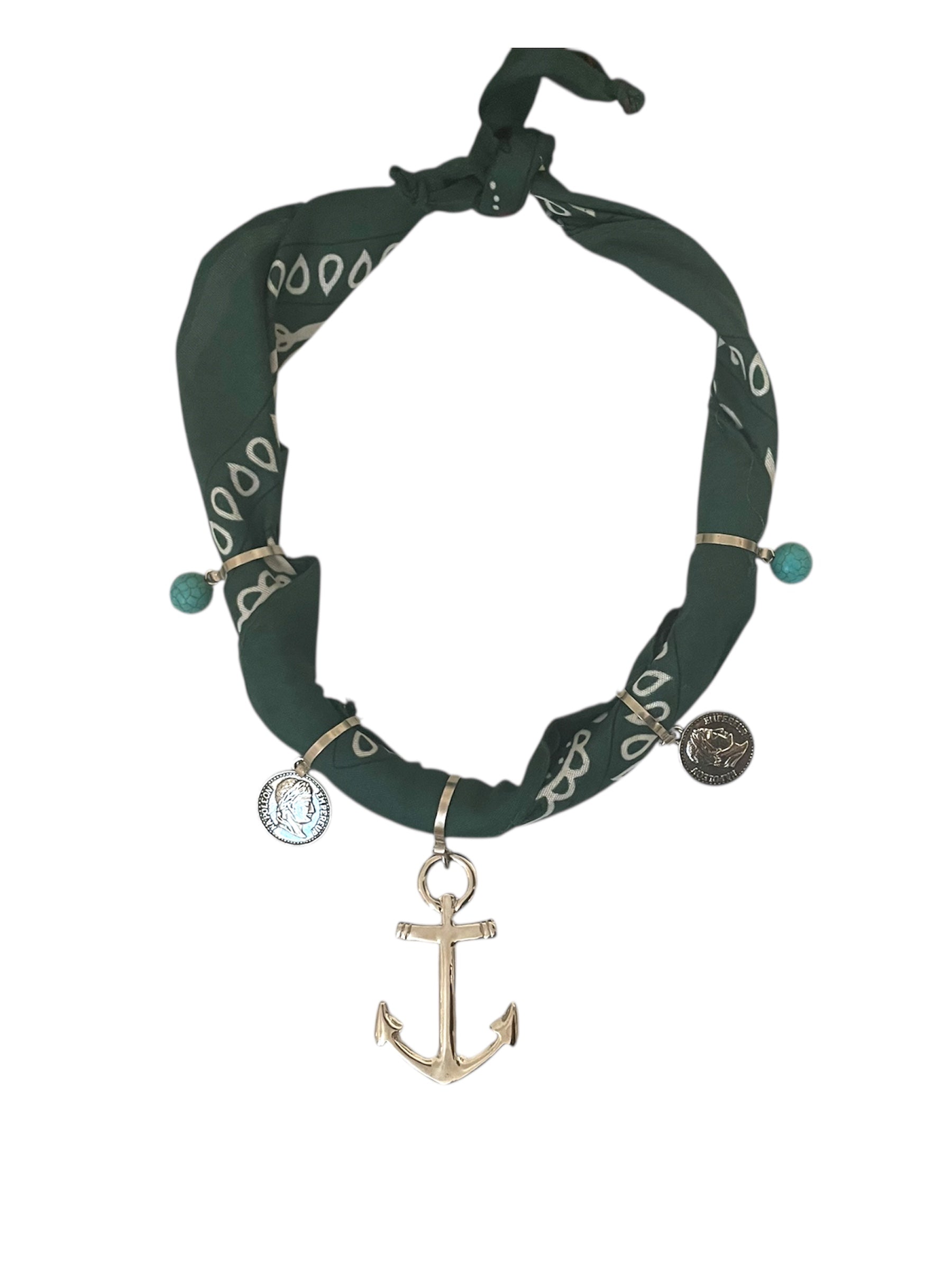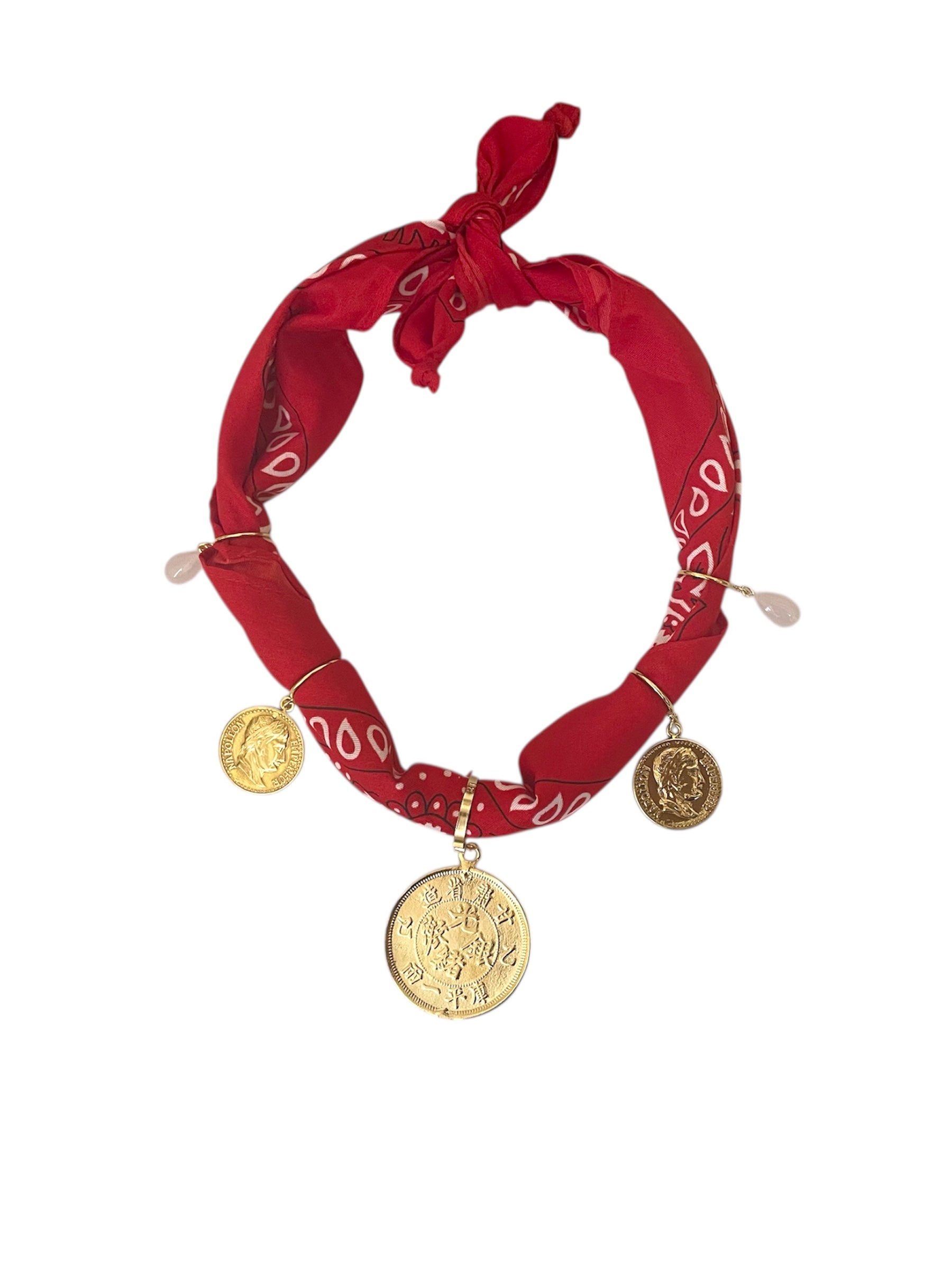 Bandana de tecido com pingentes, sendo um central e dois laterais espelhados.