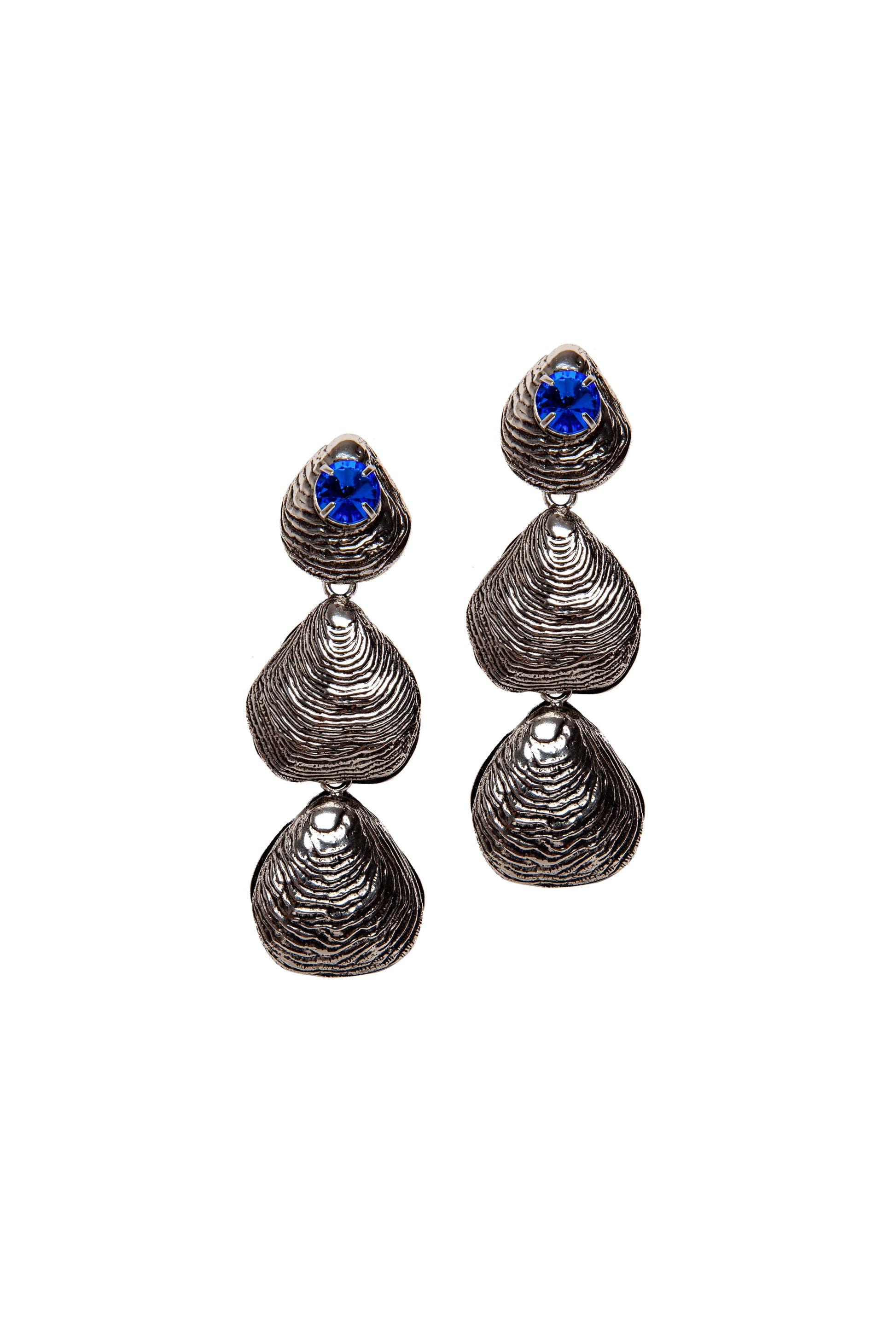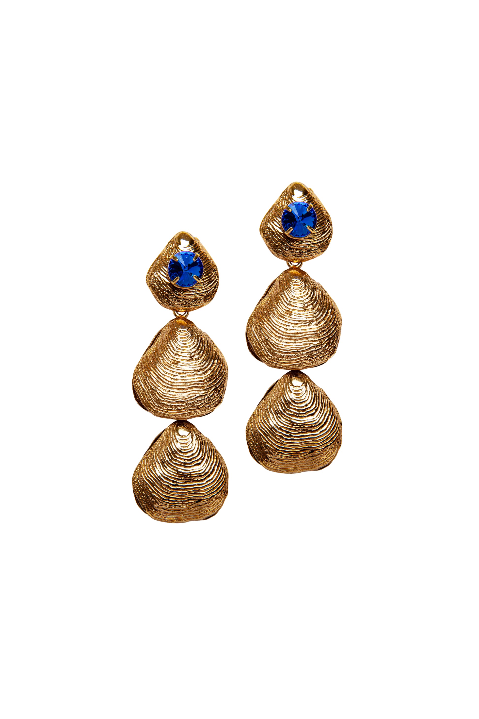 Descrição: Brinco com 3 conchas duplas de metal e cristal cravado manualmente.