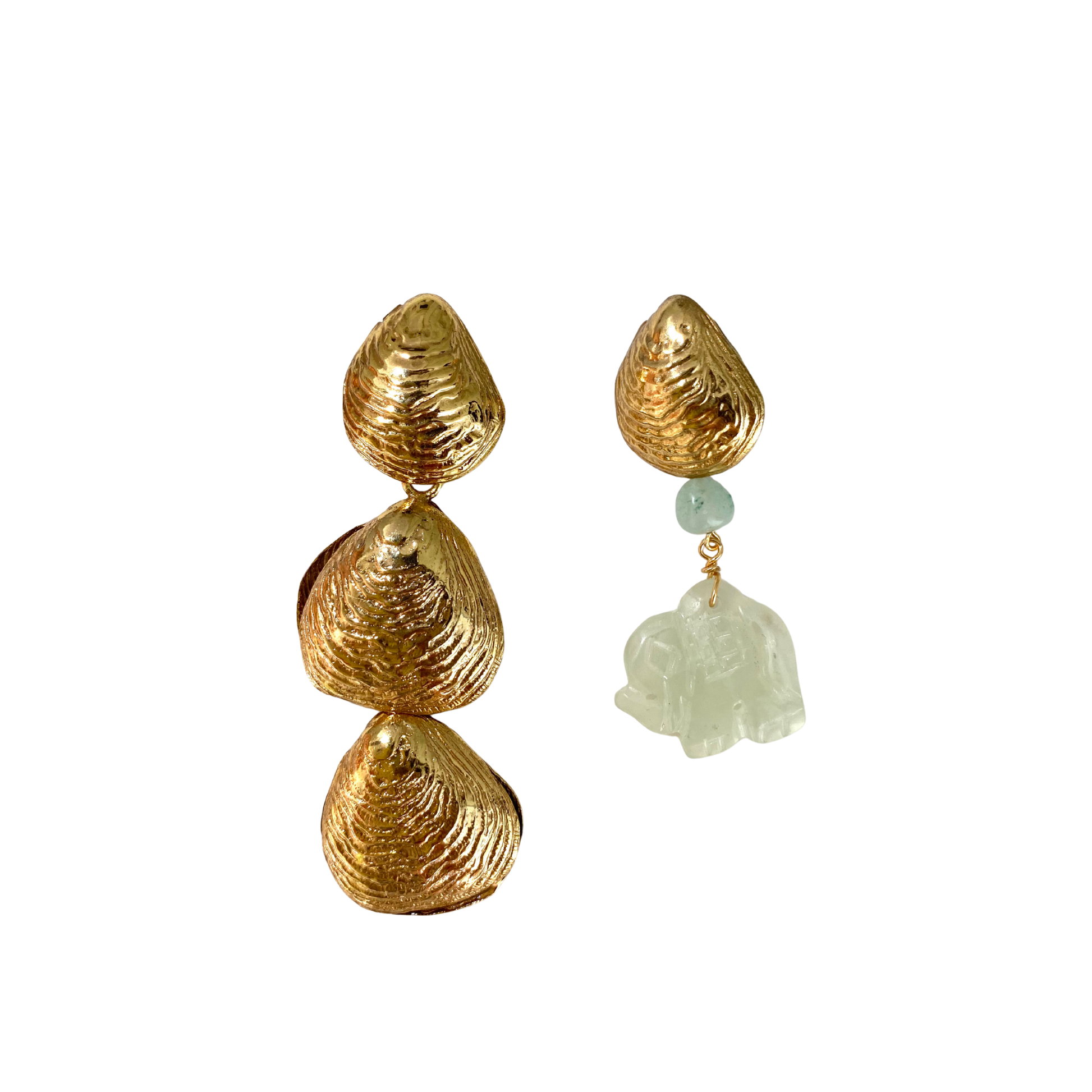 O Brinco Conchas e Elefante, possuí conchas banhadas à ouro, uma pedra de Quartzo verde e um pingente de elefante em Jade. Essa peça faz parte da nossa linha de tiragem limitada, onde produzimos peças únicas e exclusivas.