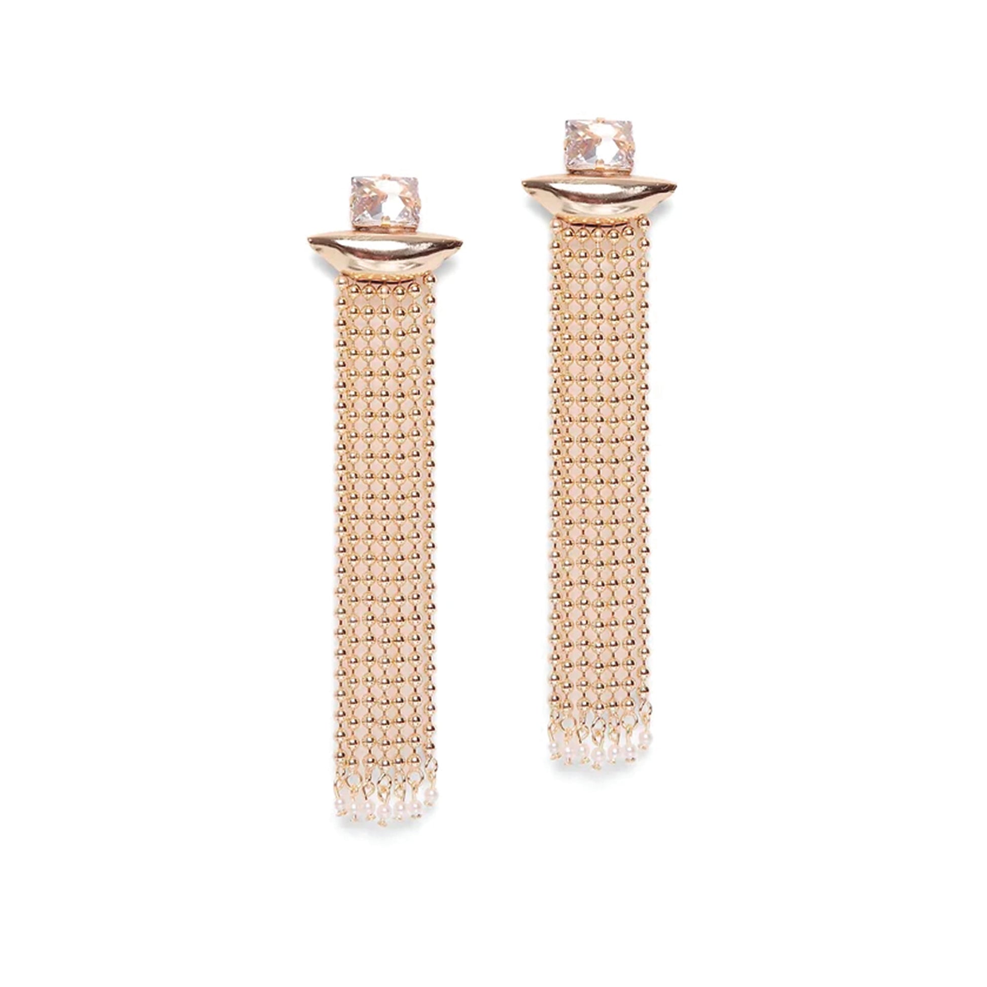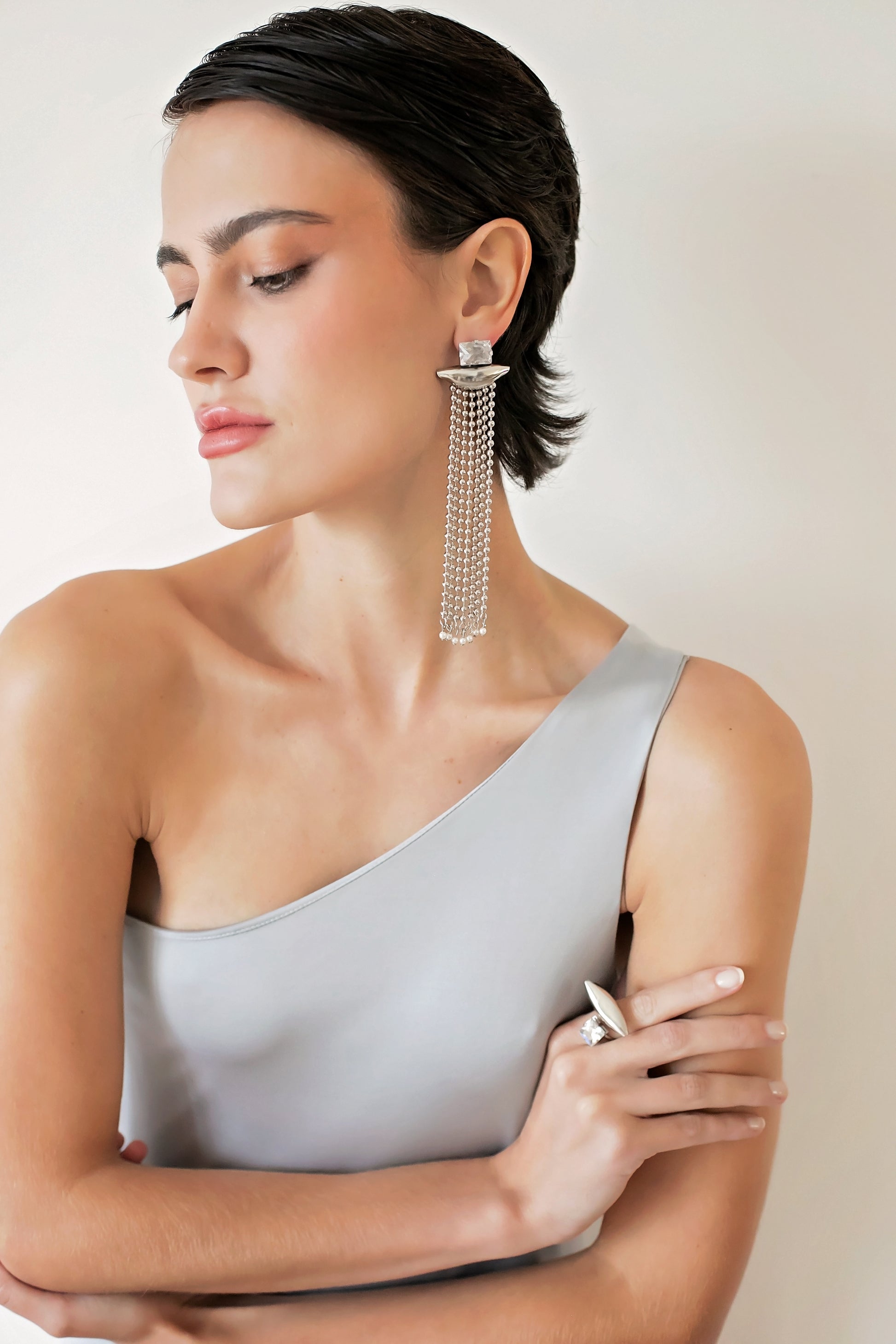 Brinco em metal banho a ouro 18K e prata com cristais. Feito à mão, finalizado em correntes de bolinhas. Fechamento em pino.