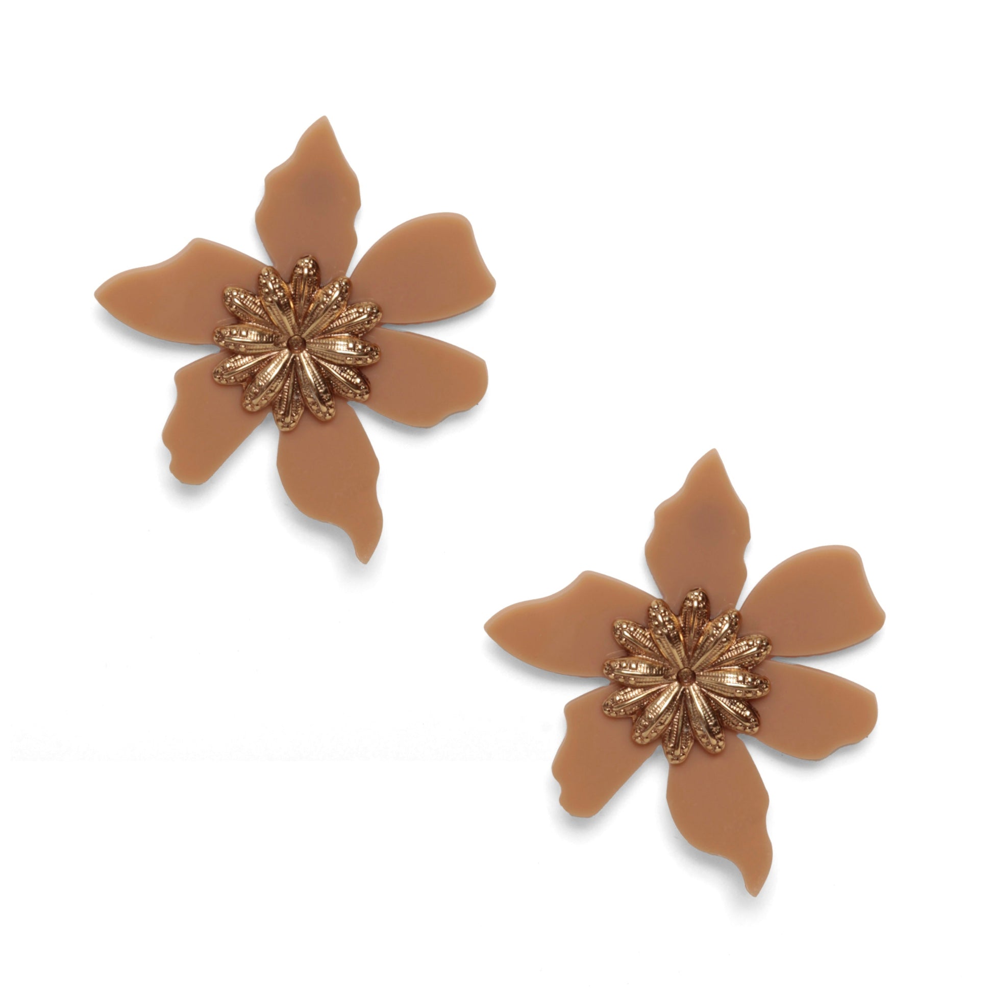 Descrição: Brinco de resina com flor de metal, banhada em ouro 18K, fechamento pino.