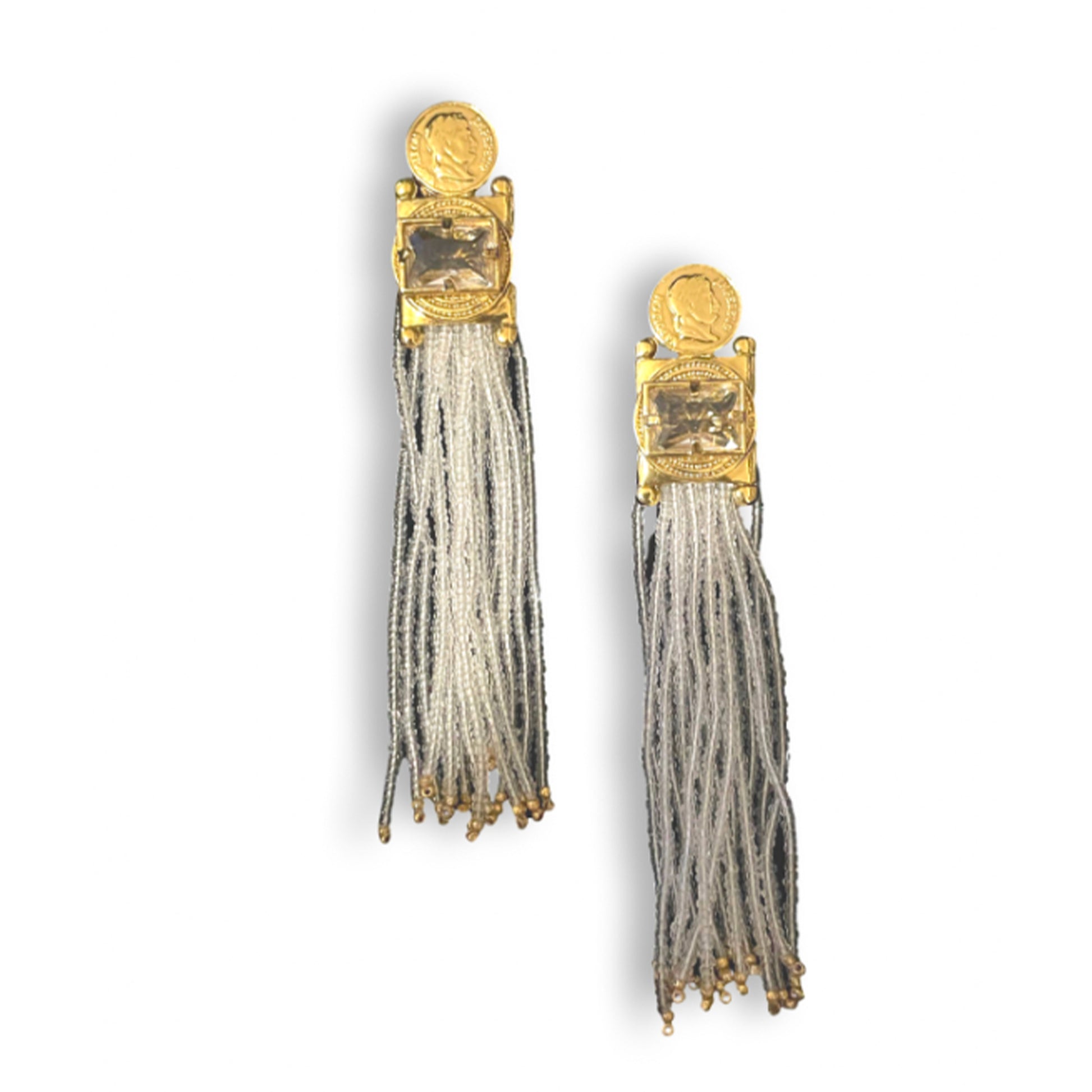 Brinco em moeda com chuveiro de miçangas. Peça banhada a ouro vintage. Fechamento em pino.