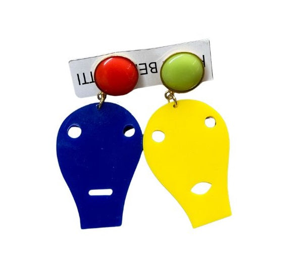 Brinco em metal banho ouro e pingente máscara em resina com 6 cm de comprimento. Fechamento em pino.