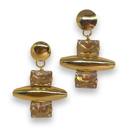 Brinco em metal banho a ouro 18K com dois cristais, feito à mão. Fechamento em pino.