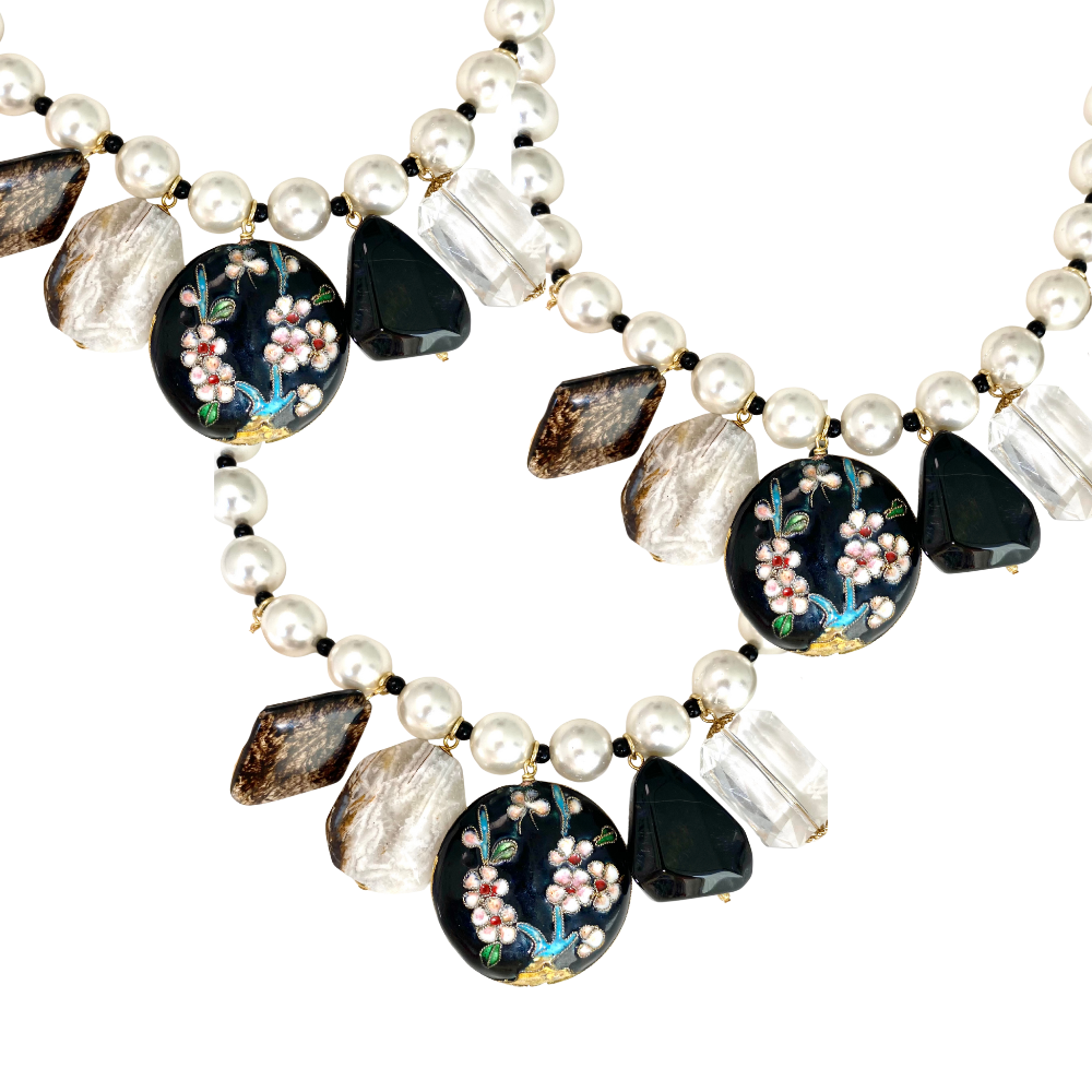 O Colar China possuí pérolas e ônix na composição de sua corrente, um cristal facetado, duas pedras naturais em gota, uma pedra de vidro preta e um totem vintage preto com Cerejeiras esculpidas. Essa peça faz parte da nossa linha de tiragem limitada, onde produzimos peças únicas e exclusivas.
