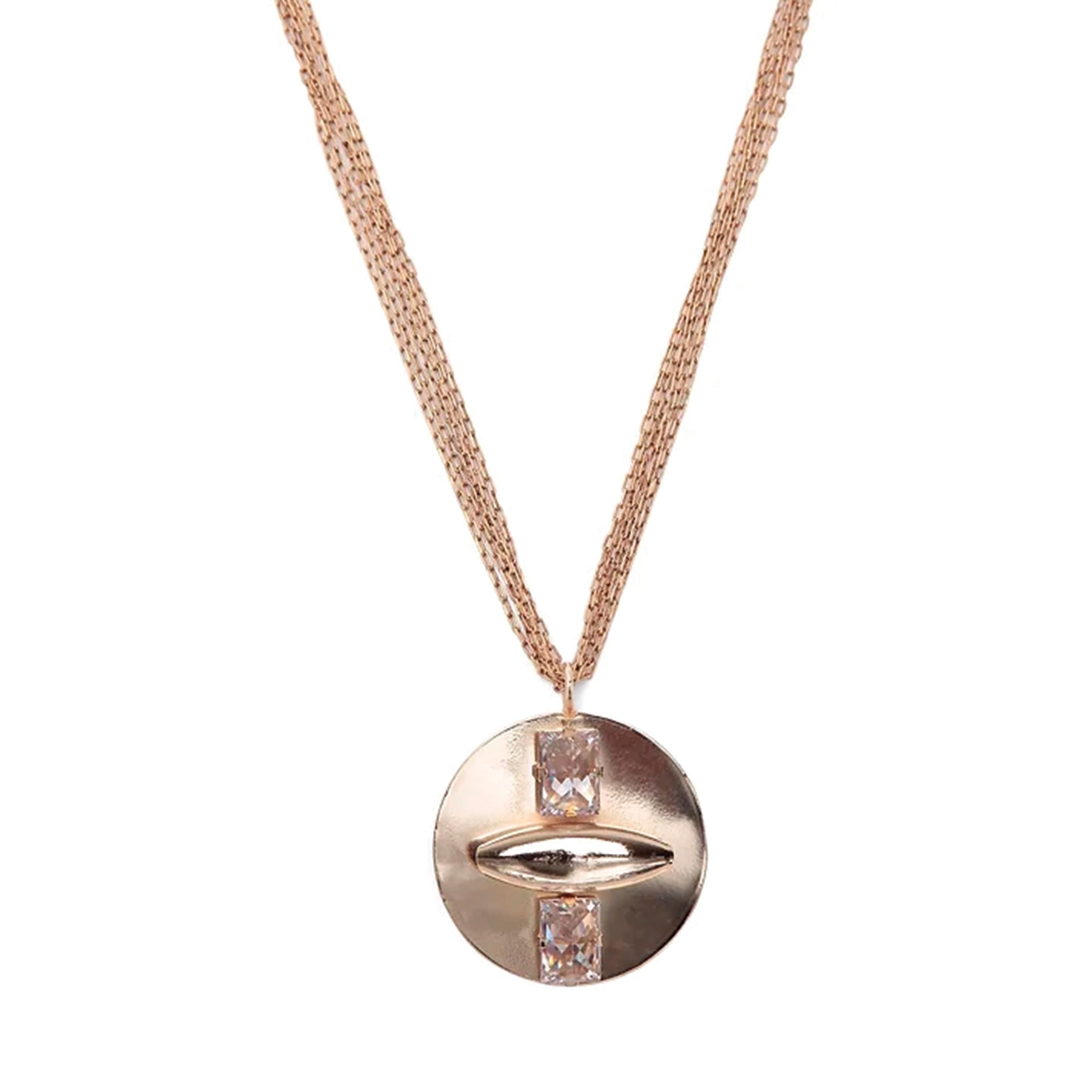 Colar disco em metal banho a ouro 18K com dois cristais, feito à mão. Fechamento em mosquetão.