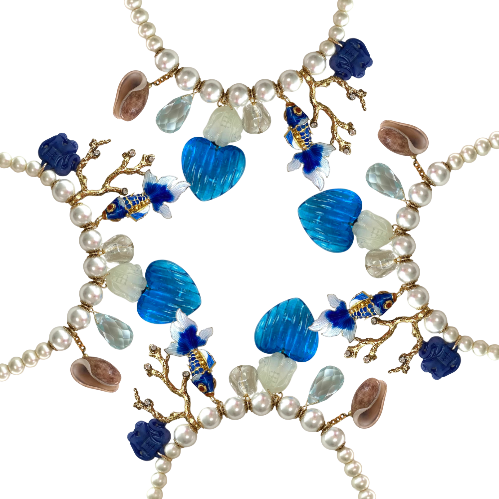 O Colar Degradê Pérolas Fundo do Mar possuí um coração azul em vidro, coral em metal banhado à ouro com cristal Swarovski, búzios natural, uma gota aquamarine cravejada, dois elefantes em Jade e Lápis Lazuli, uma pedra em vidro orgânica e um peixe articulado azul e dourado. Essa peça faz parte da nossa linha de tiragem limitada, onde produzimos peças únicas e exclusivas.
