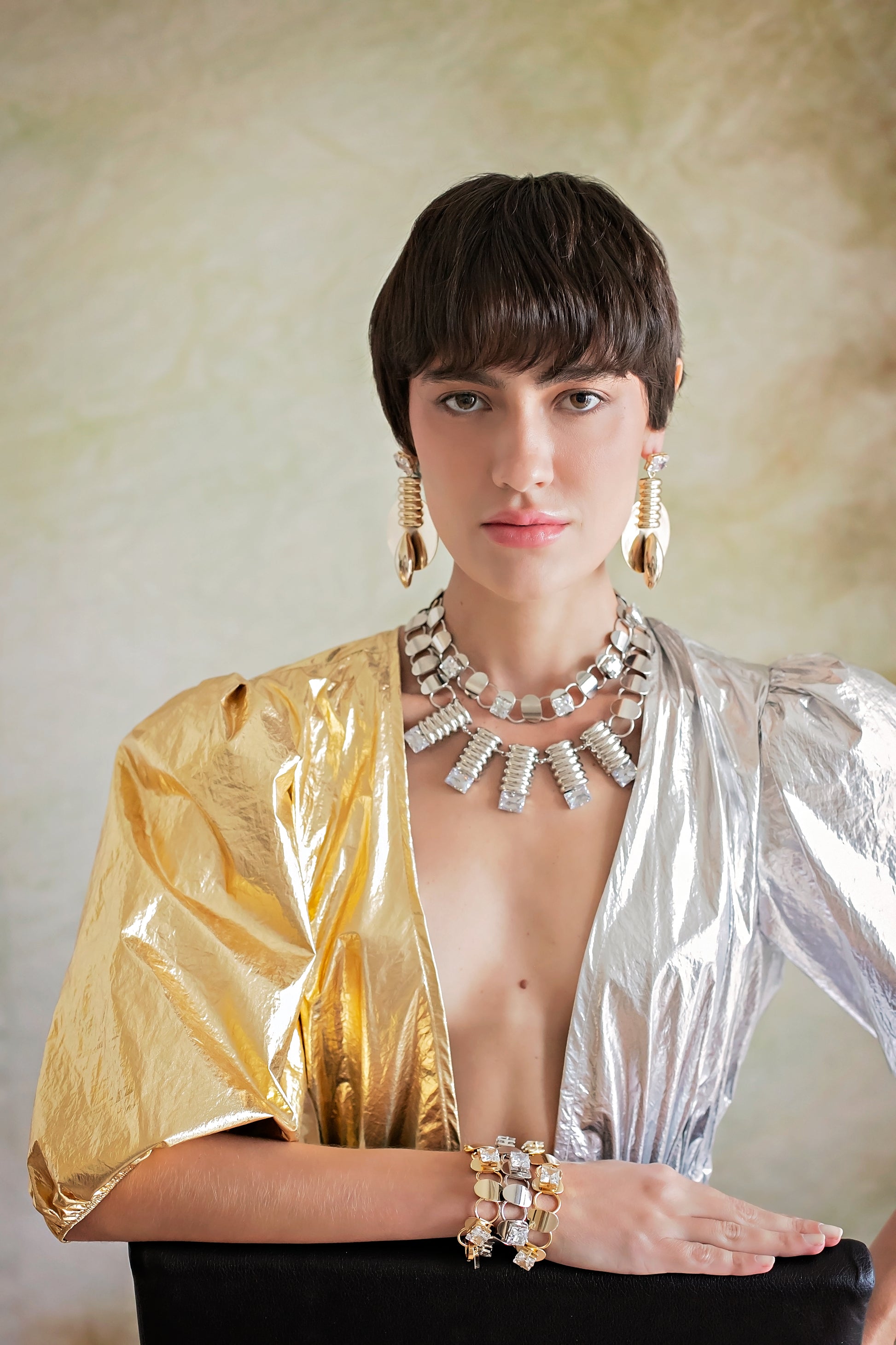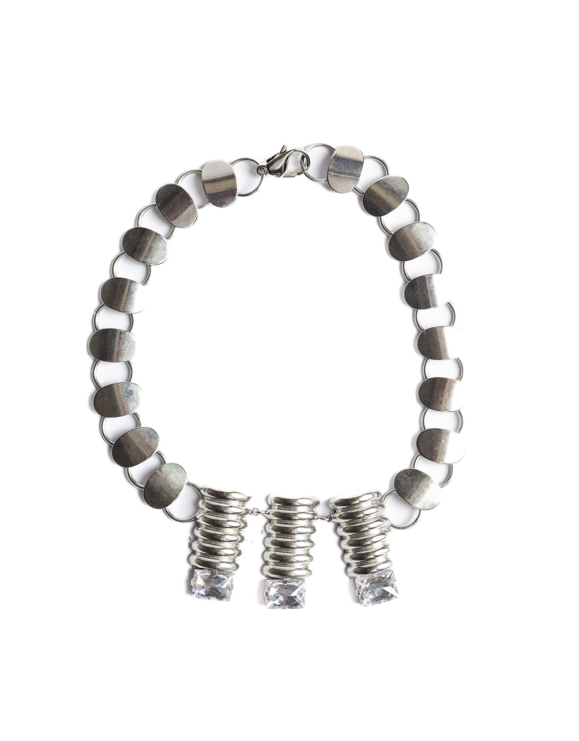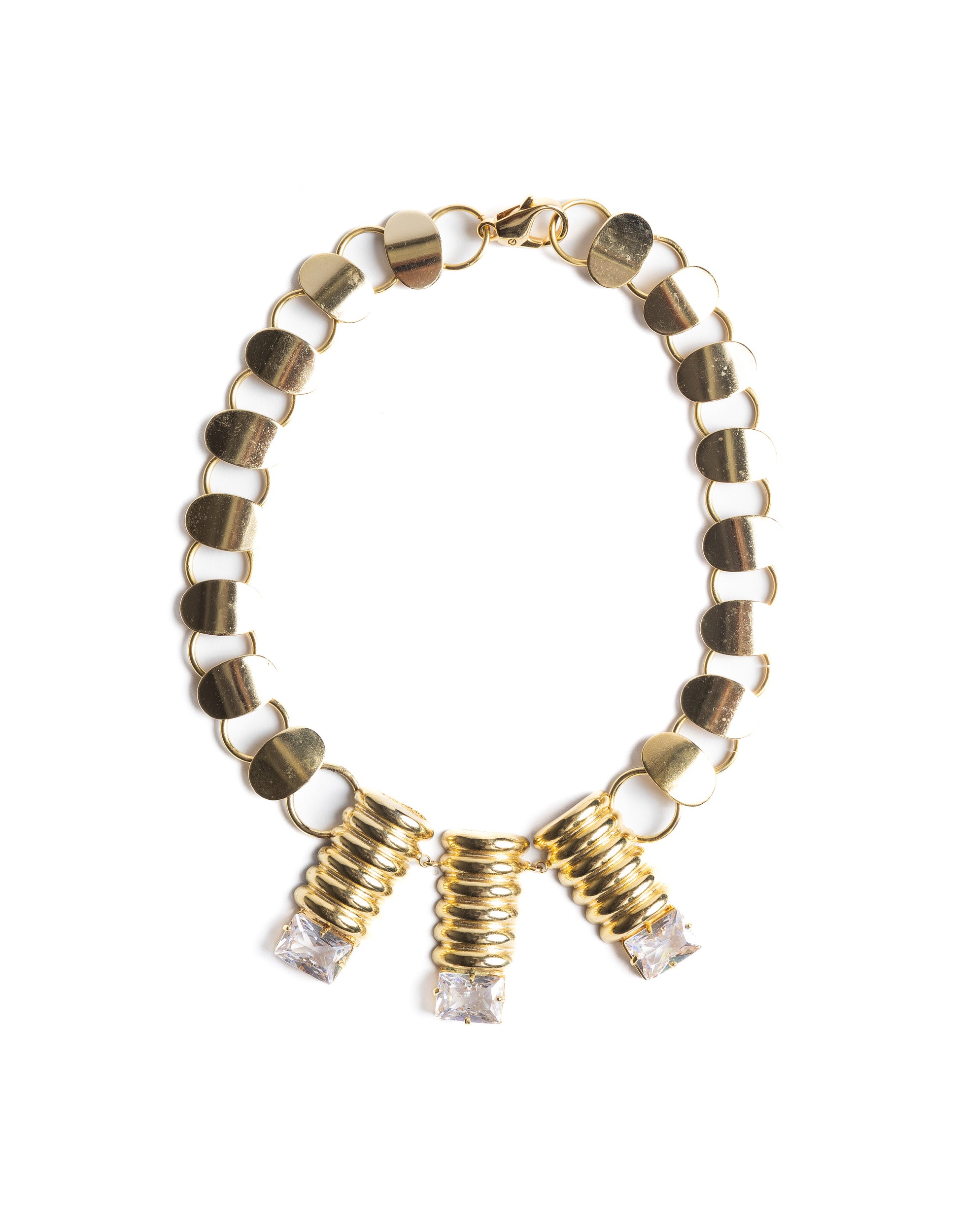 Colar em metal banho a ouro 18K e prata com cristais, feito à mão com 40cm de comprimento. Fechamento em mosquetão.