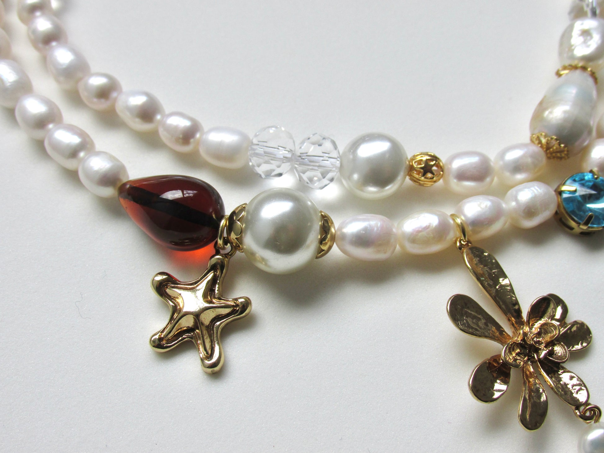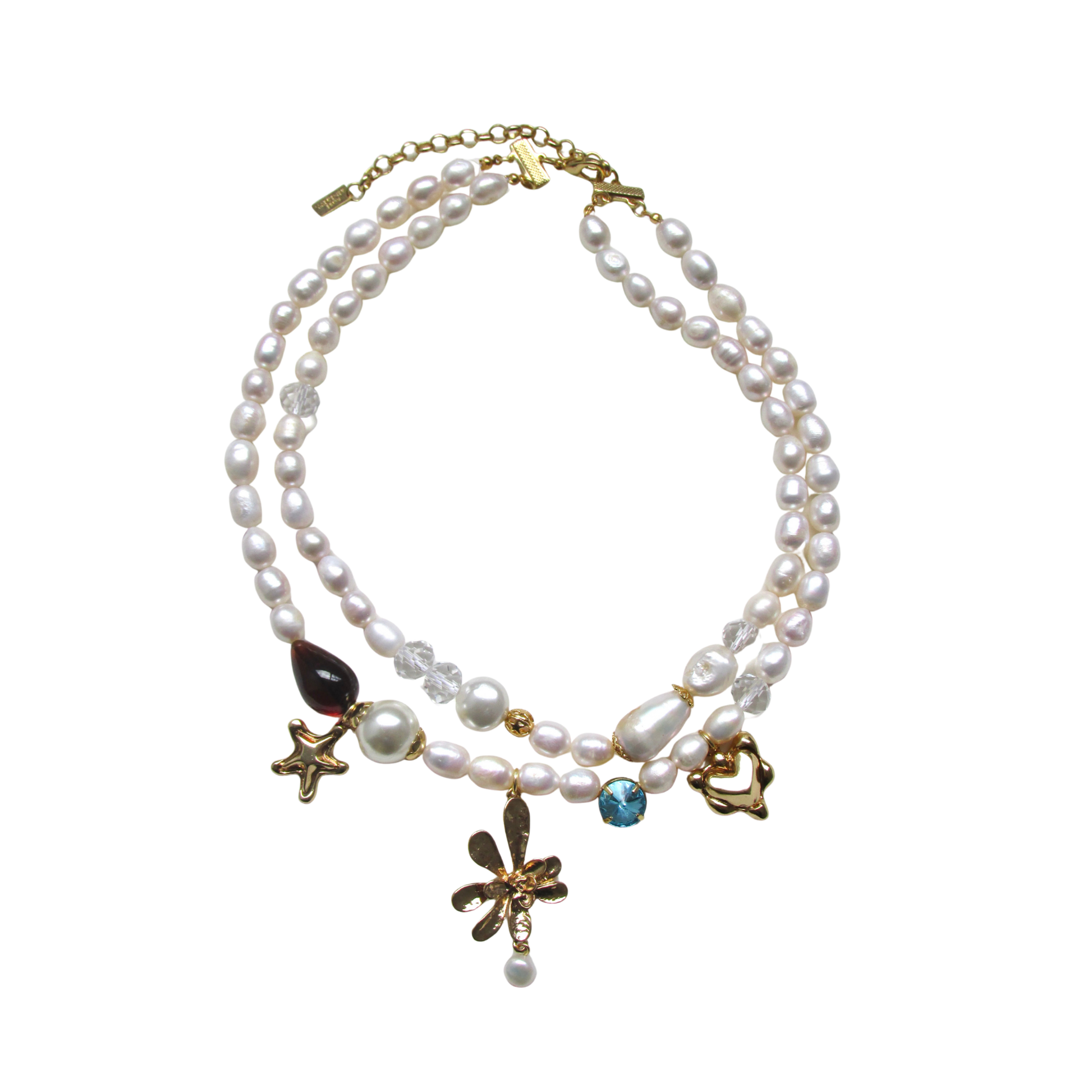 Colar duplo de pérolas barrocas de água doce, strass em aquamarine e gota vinho em vidro. A peça também possuí três charms, todos banhados em ouro.