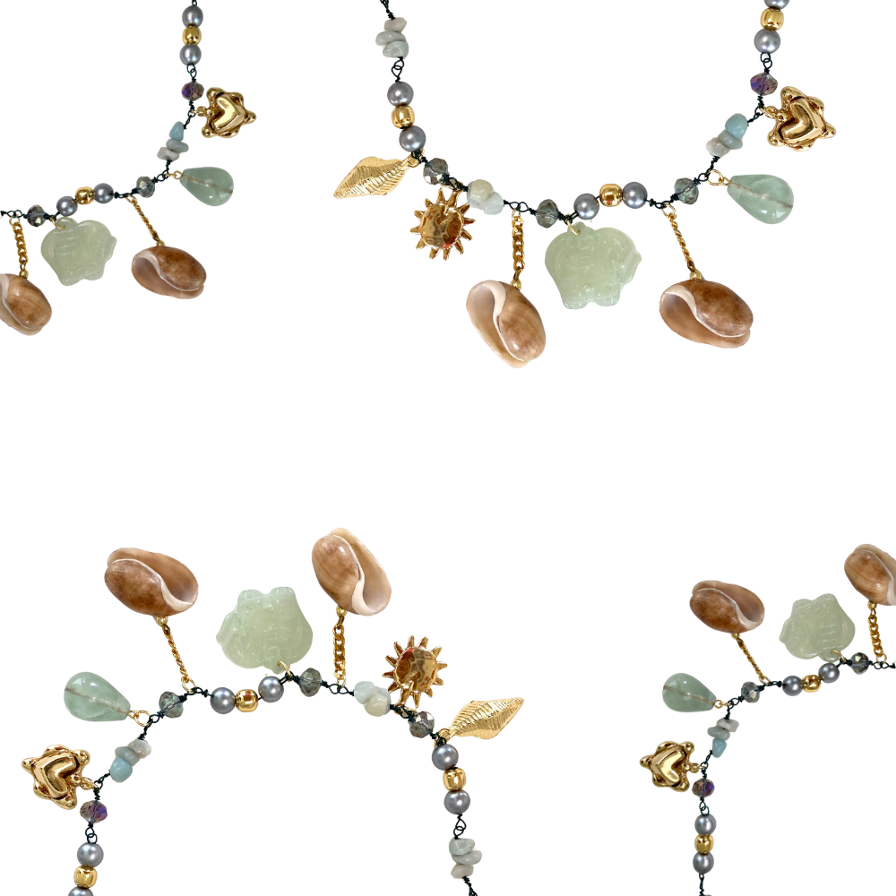 O Colar Elefante Jade e Pérolas Verde, possuí pérolas verdes e douradas, cristais facetados azulados, um elefante verde em jade, duas conchas naturais, um pingente de coração banhado à ouro, um pingente de concha banhado à ouro e um pingente de sol banhado à ouro. Essa peça faz parte da nossa linha de tiragem limitada, onde produzimos peças únicas e exclusivas.