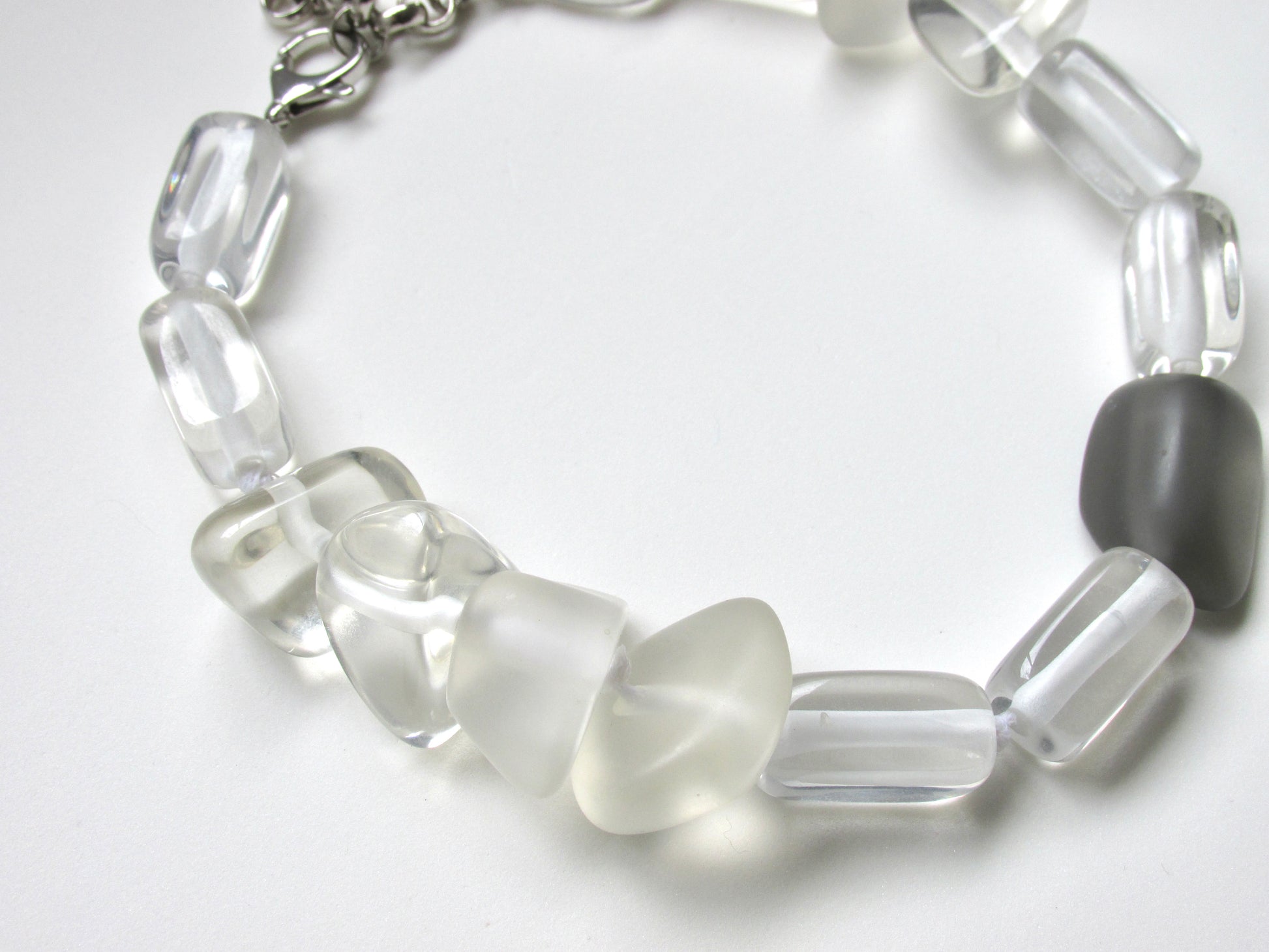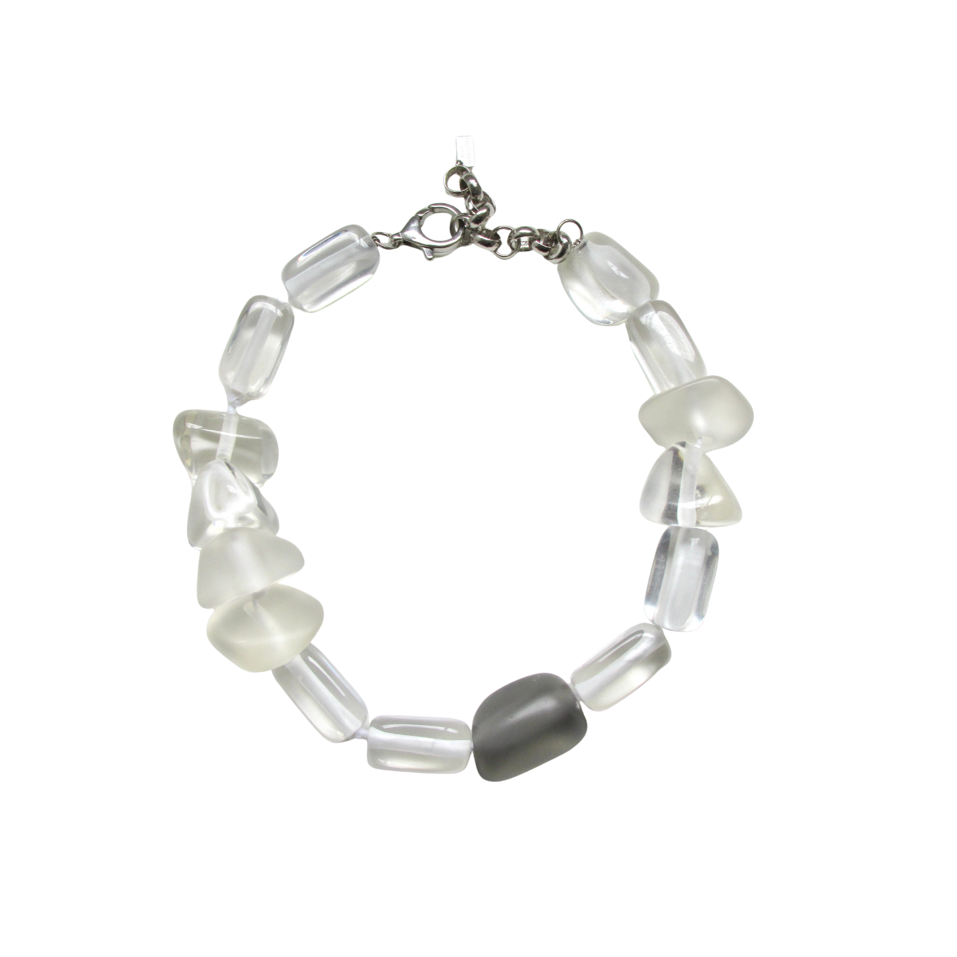 Colar Fragmentos Lúmen possuí peças em resina transparente, resina Lalique branca fosca e preta fosca. Possuí corrente portuguesa com regulagem.