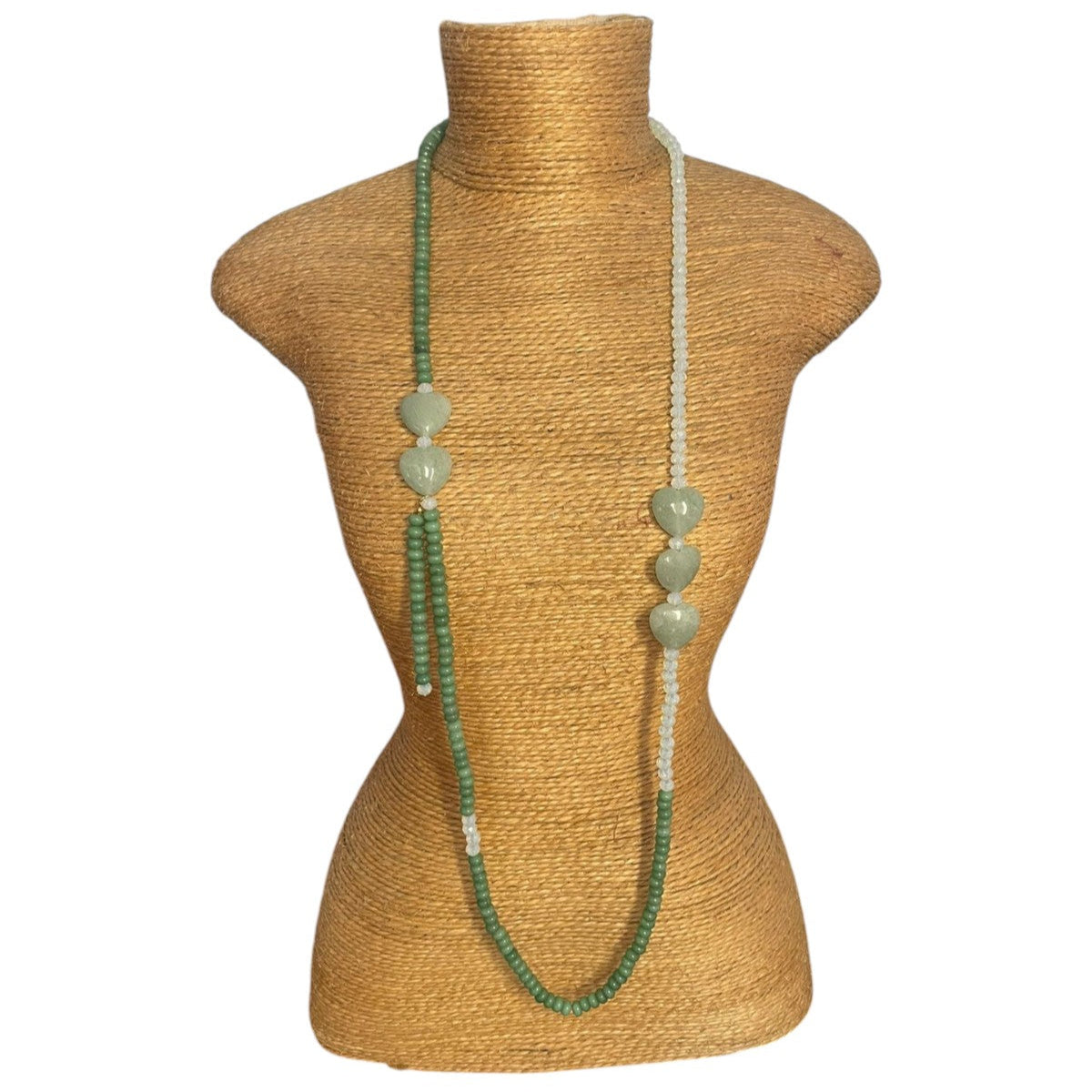 Colar longo feito manualmente, com pedras de Jade, cristais furta cor facetados e 5 pedras de jade, em formato de coração, projetado para ser usado com uma, ou duas voltas.