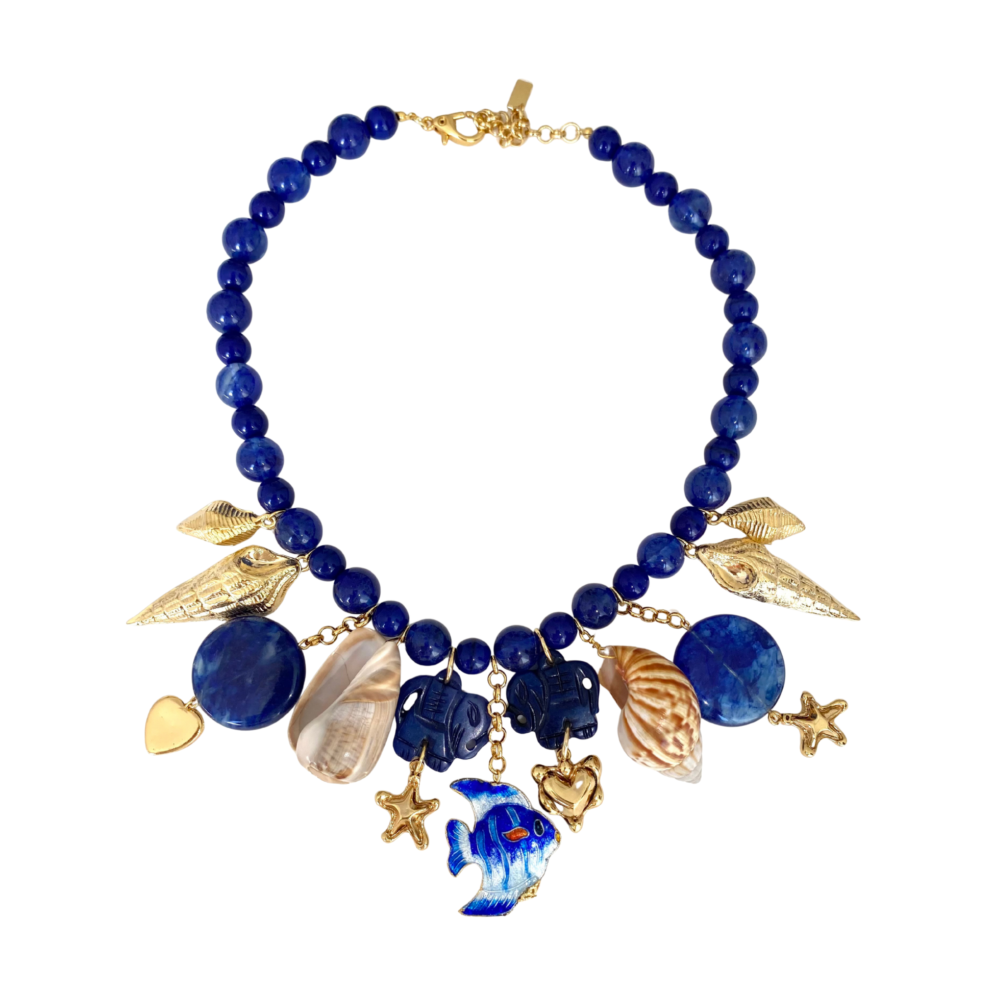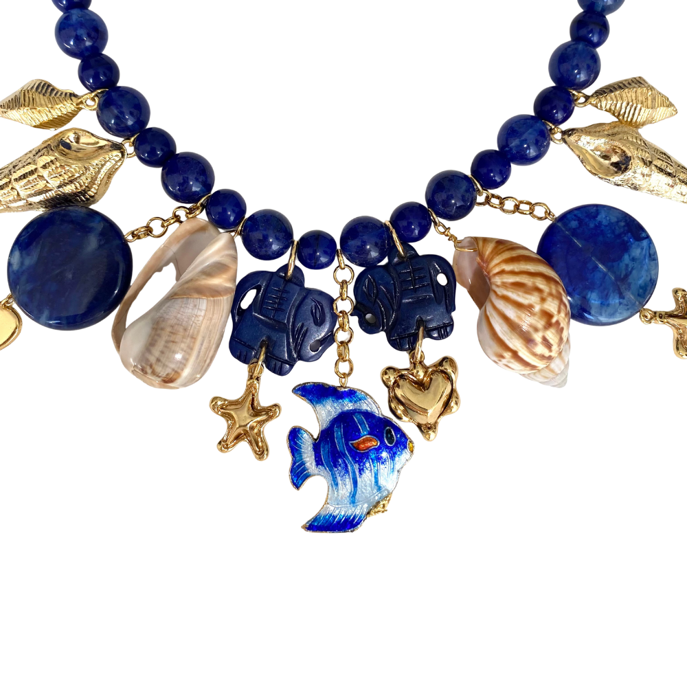 O Colar Lápis Lázuli possuí uma corrente feita de pedras Lápis Lazuli de tamanhos diversos em sua composição, um peixe azul, conchas naturais, elefantes em Lápis Lazuli, conchas de metal banhadas à ouro, charms de estrela e coração também banhados à ouro. Essa peça faz parte da nossa linha de tiragem limitada, onde produzimos peças únicas e exclusivas.