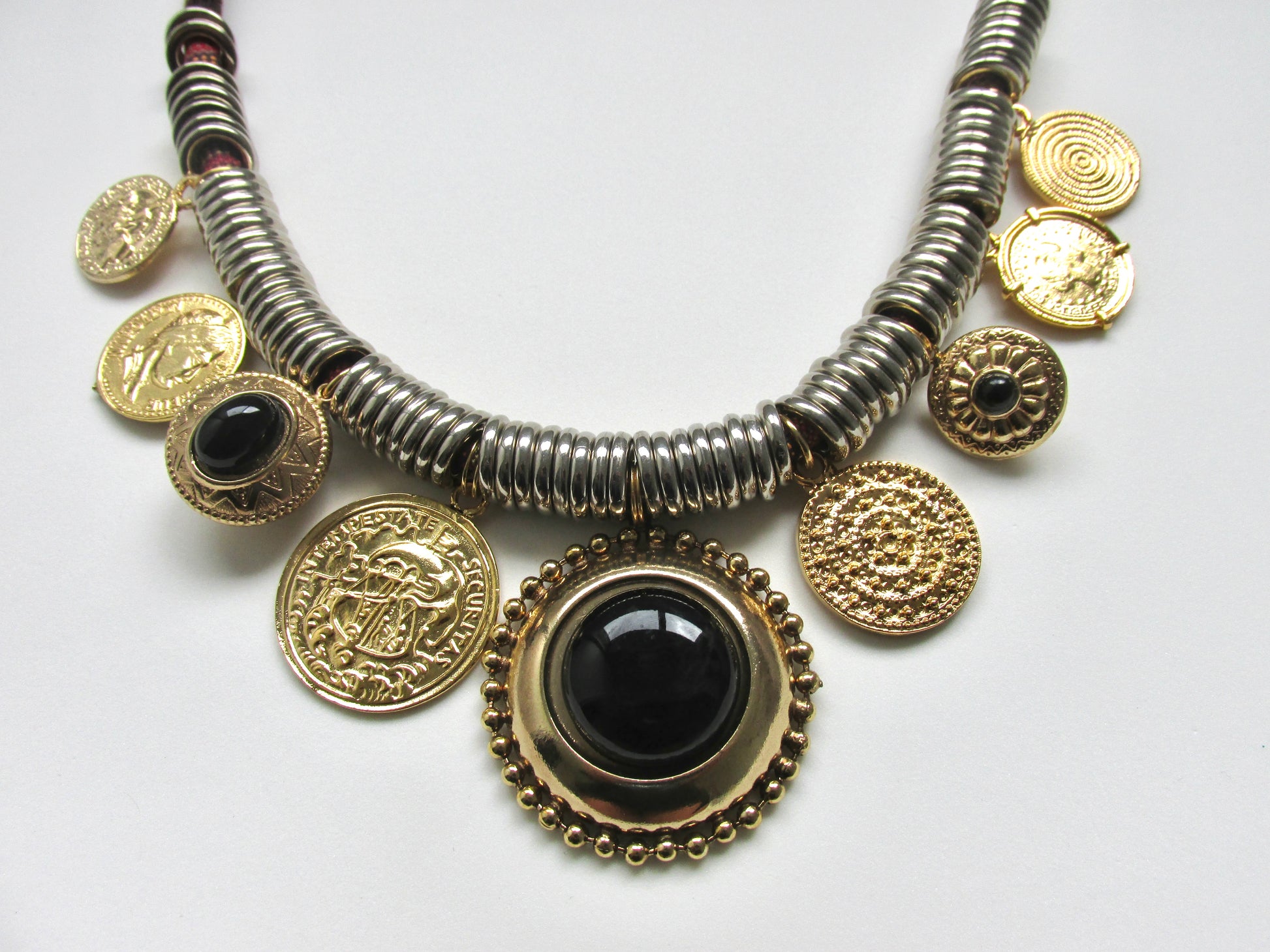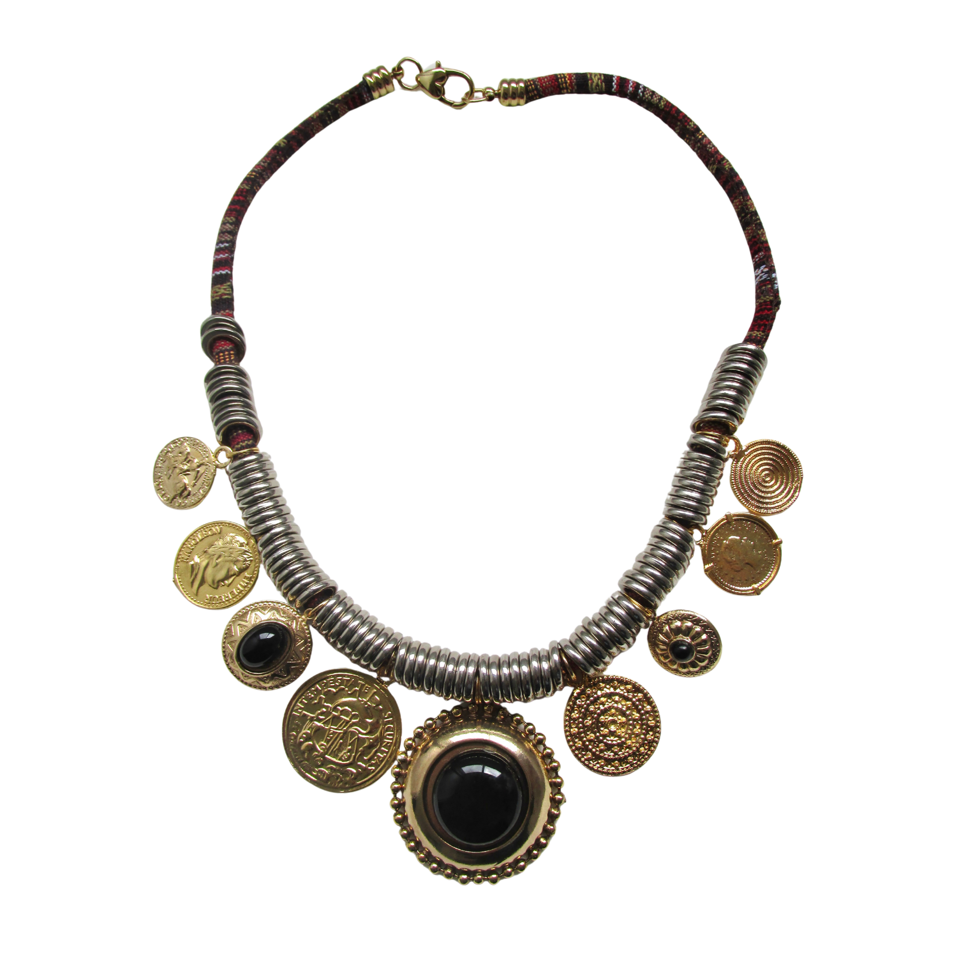 O Colar Marrakesh acompanha pingentes moeda banhados à ouro com aplicações de pedras em resina preta, argolas prateadas e um cordão de algodão decorado com costuras de linhas em tons terrosos. Comprimento 45 cm.