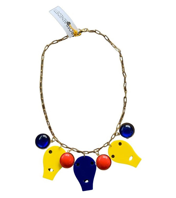Colar em corrente banho ouro com 5 pingentes de máscara com 45 cm de fio a fio. Fechamento em mosquetão.