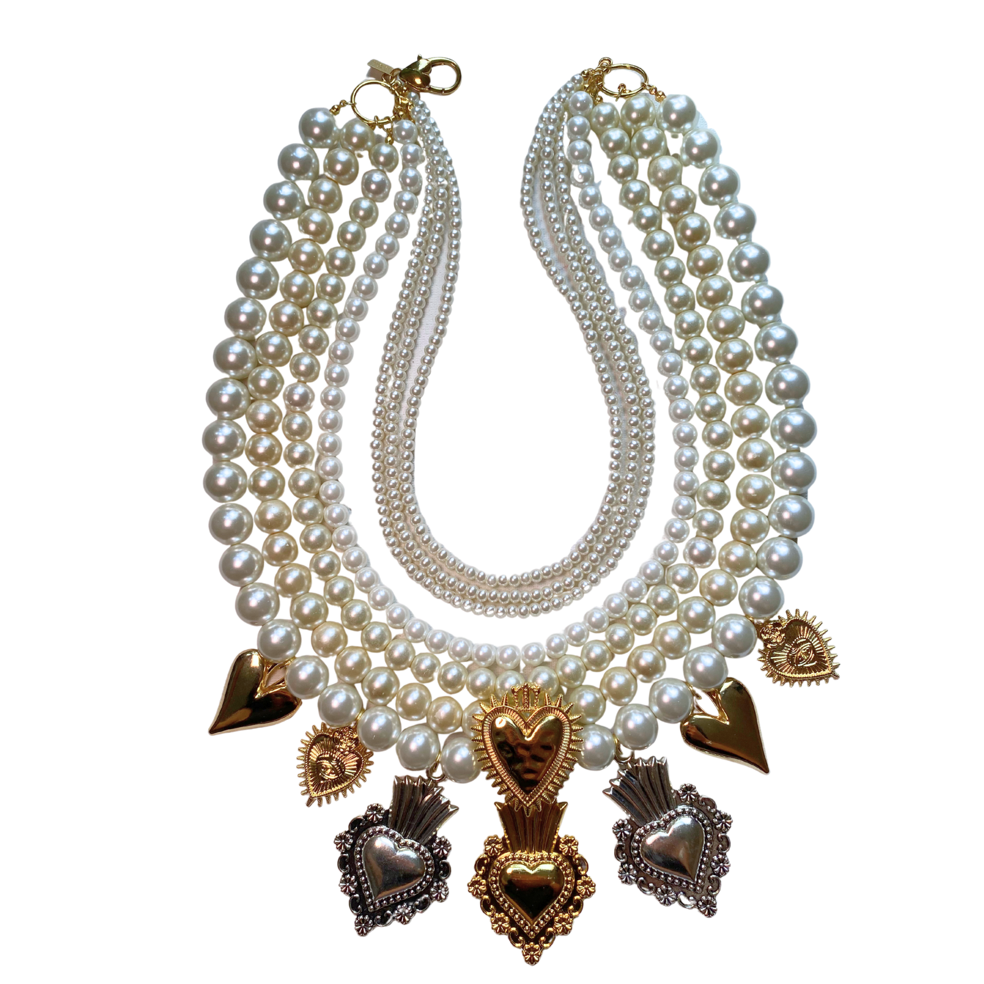 O Colar Maxi Pérolas e Corações possuí pérolas de rio e pérolas de vidro em sua composição. O Colar possuí pérolas de diversos tamanhos, além disso, seus pingente em forma de coração, em metal, são banhados em prata e ouro 18K. Possuí 46cm de comprimento.