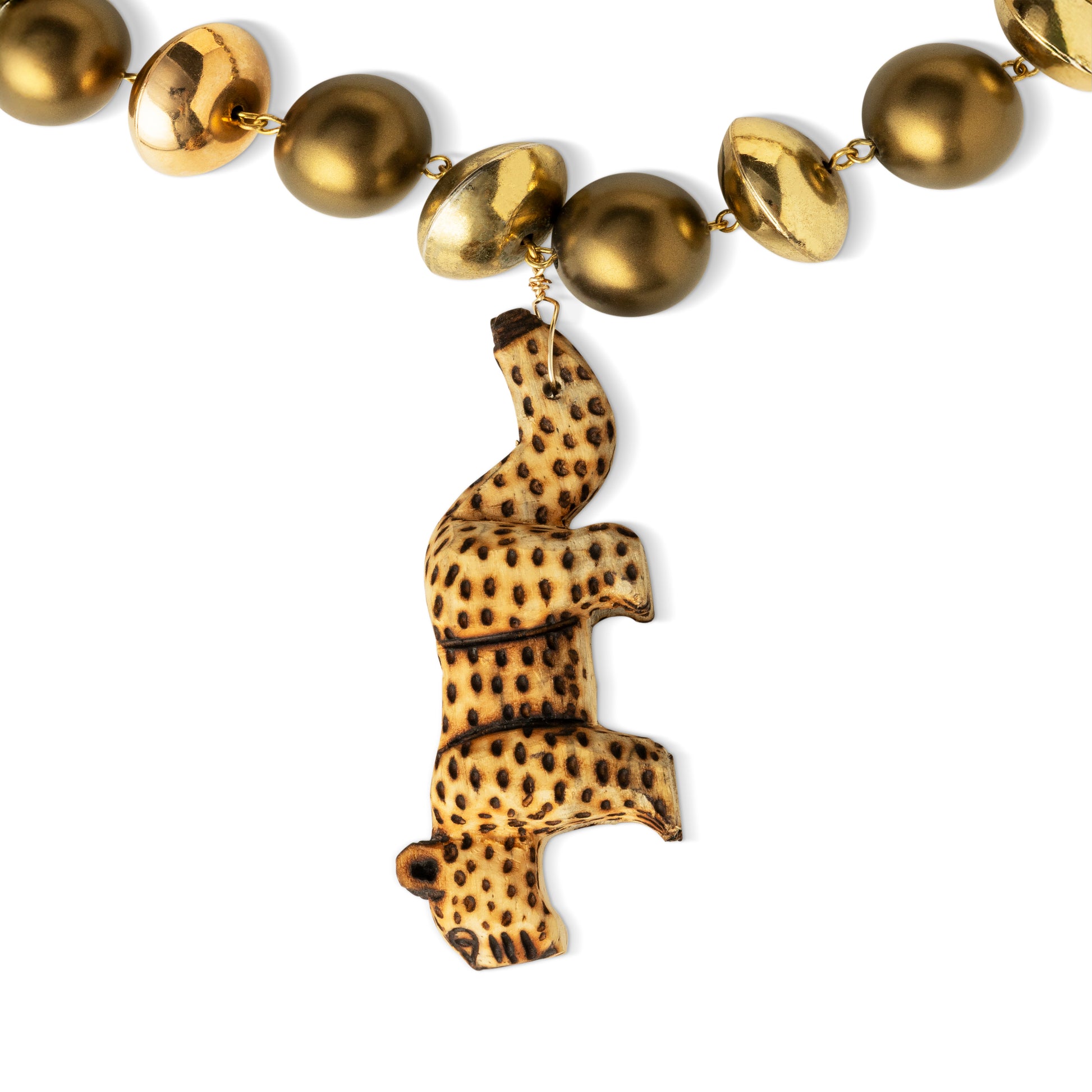 Colar artesanal que celebra a cultura indígena de Santa Catarina. Apresenta uma onça de madeira esculpida à mão, símbolo de força e proteção nas tradições ancestrais, acompanhada por pingentes redondos e discos em metal banhado a ouro 24k. Peça única e longa.