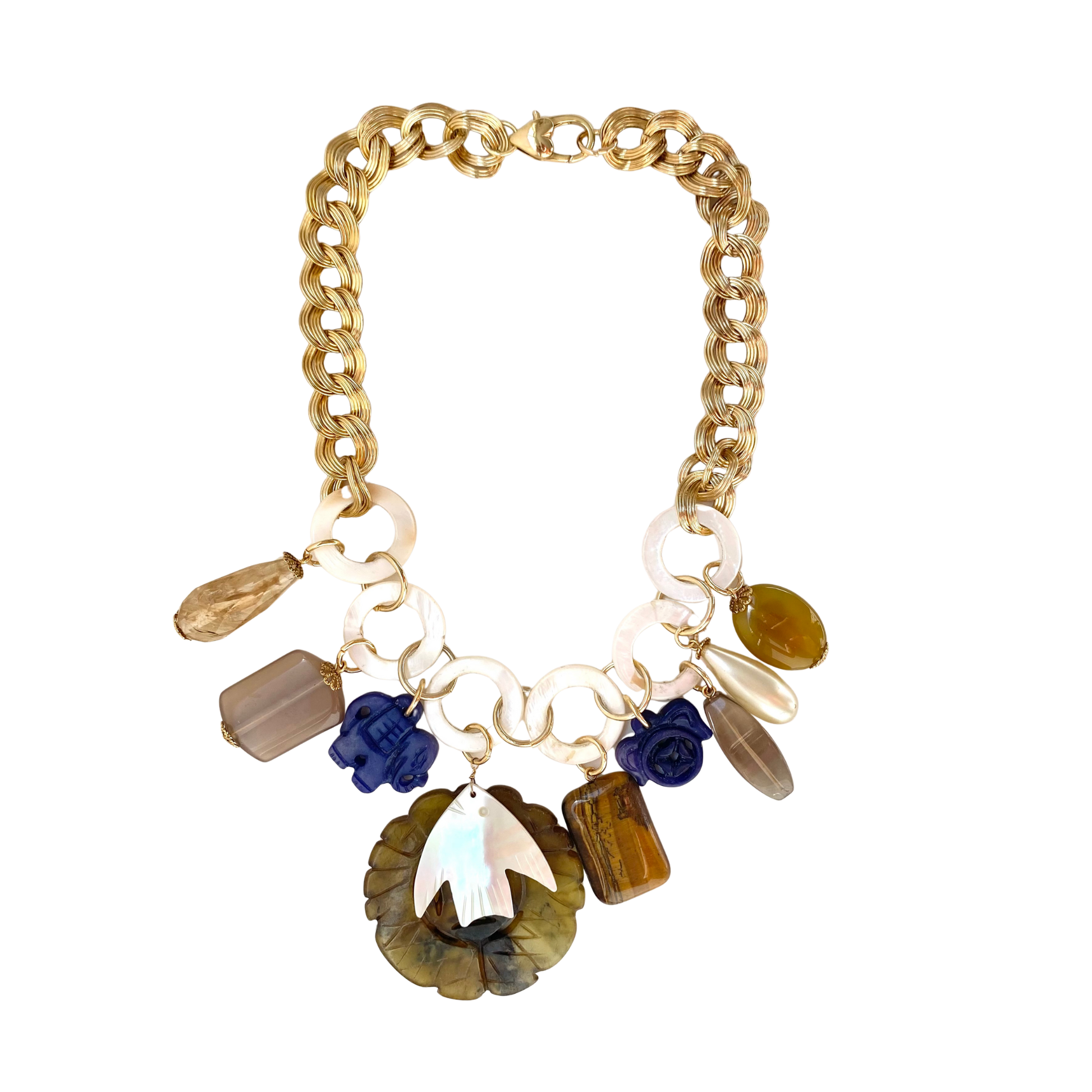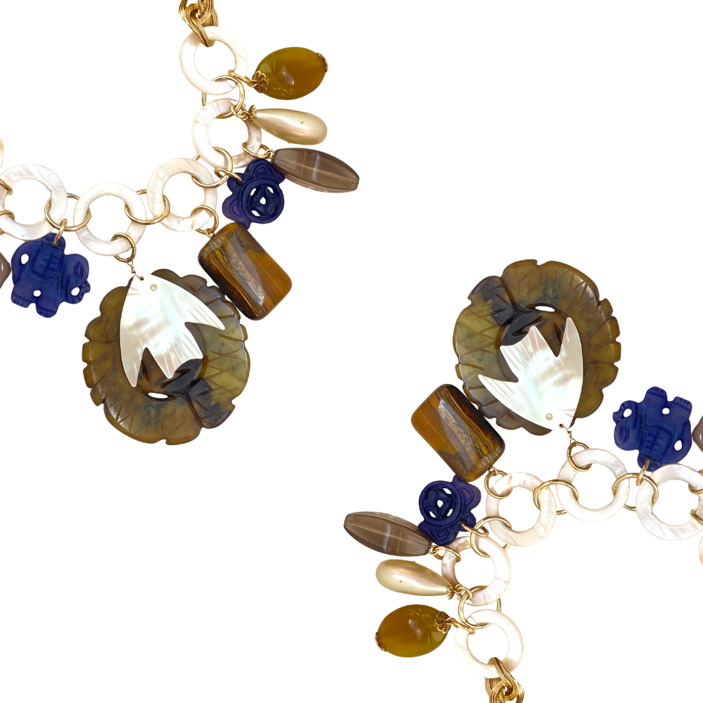 O Colar Peixe e Amuletos Marrom possuí um peixe em Madre Pérola, uma pedra olho de tigre, um amuleto chinês em pedra natural, duas pedras em Lápis Lázuli, uma gota em pérola, uma gota facetada em vidro amarelo. Essa peça faz parte da nossa linha de tiragem limitada, onde produzimos peças únicas e exclusivas. A corrente possuí 45cm.