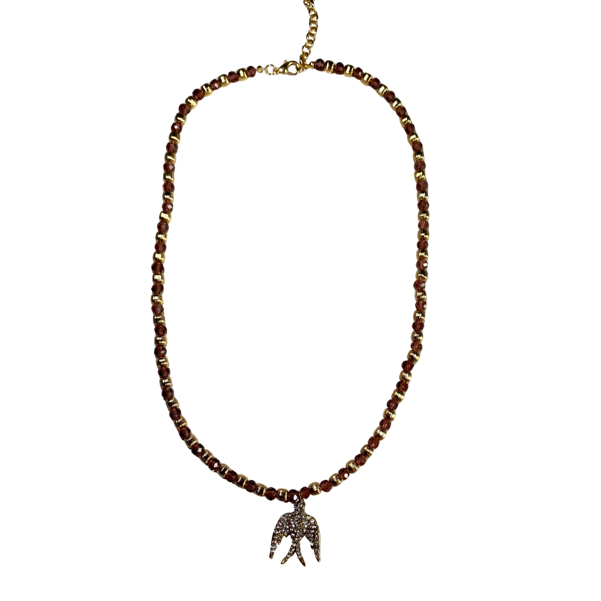 O Colar Pomba Longo e Cristal Roxo possuí uma pomba cravejada com cristais Swarovski, cristais facetados roxos e entremeio em metal dourado. Comprimento de 45 cm.
