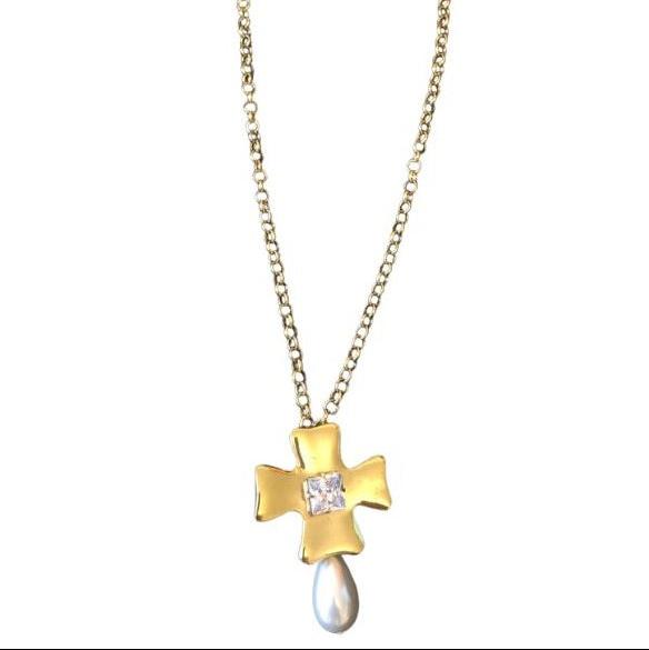 Colar corrente banho a ouro 18k, pingente em cruz com cristal e gota de pérola. Comprimento ajustável, fechamento em mosquetão.