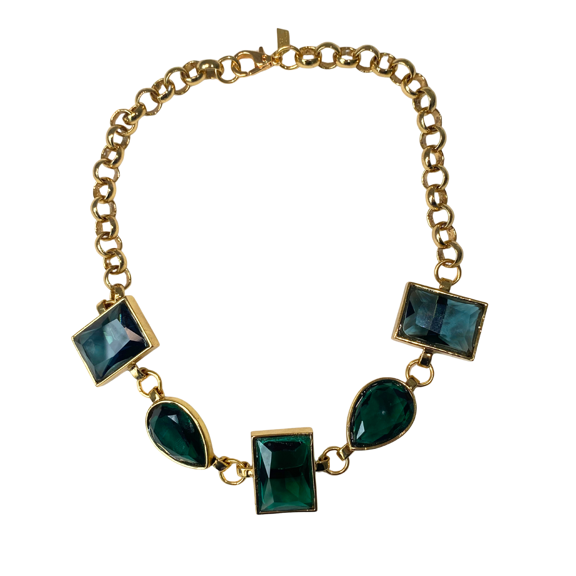 O Colar Realeza Cristais Josephine possuí pedras facetadas azúis e verdes, corrente portuguesa e 48 cm de comprimento. Todos os metais são banhados no ouro 18k.