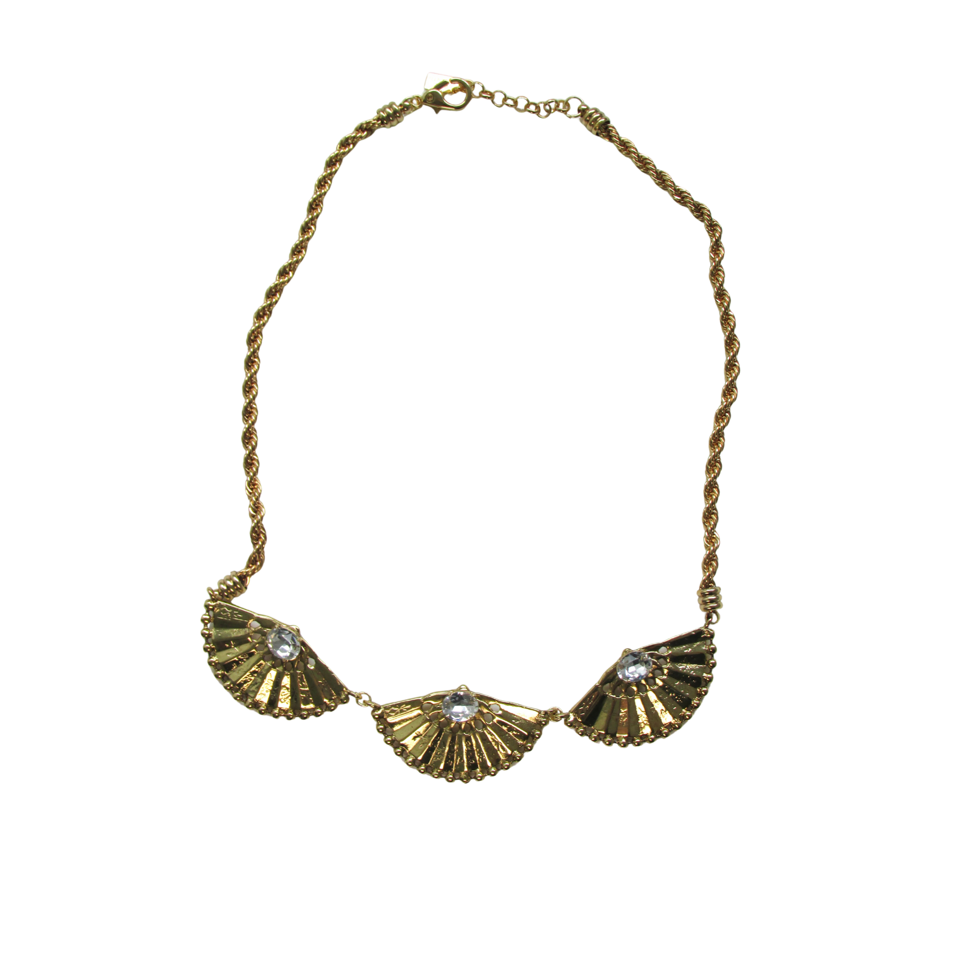 O Colar acompanha Três Leques banhados à ouro, recebe aplicação de cristais Swarovski e corrente roliça.
