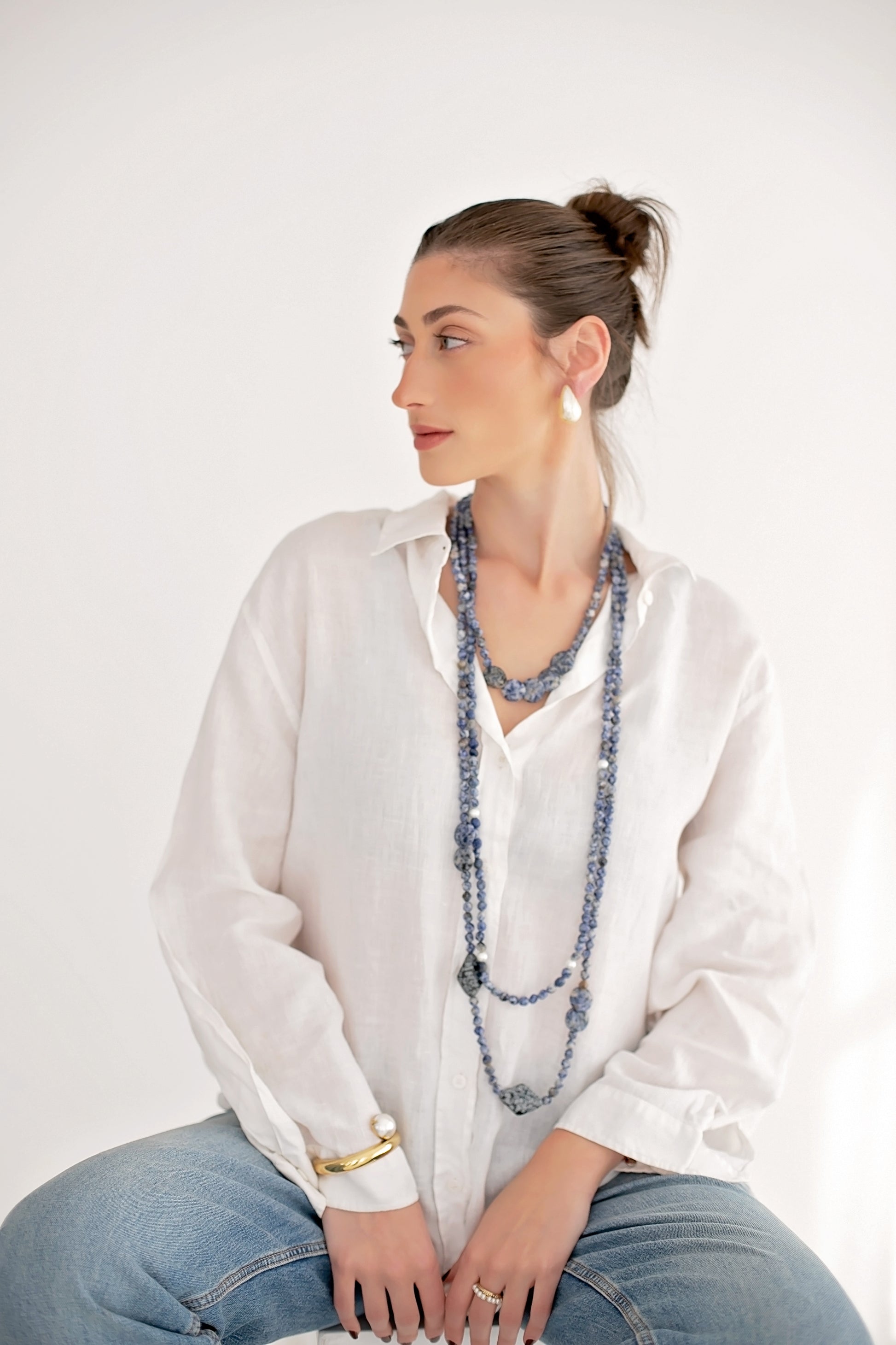 Materiais: Pedras de lápis lazuli, pérola de rio e metal com banho ouro.