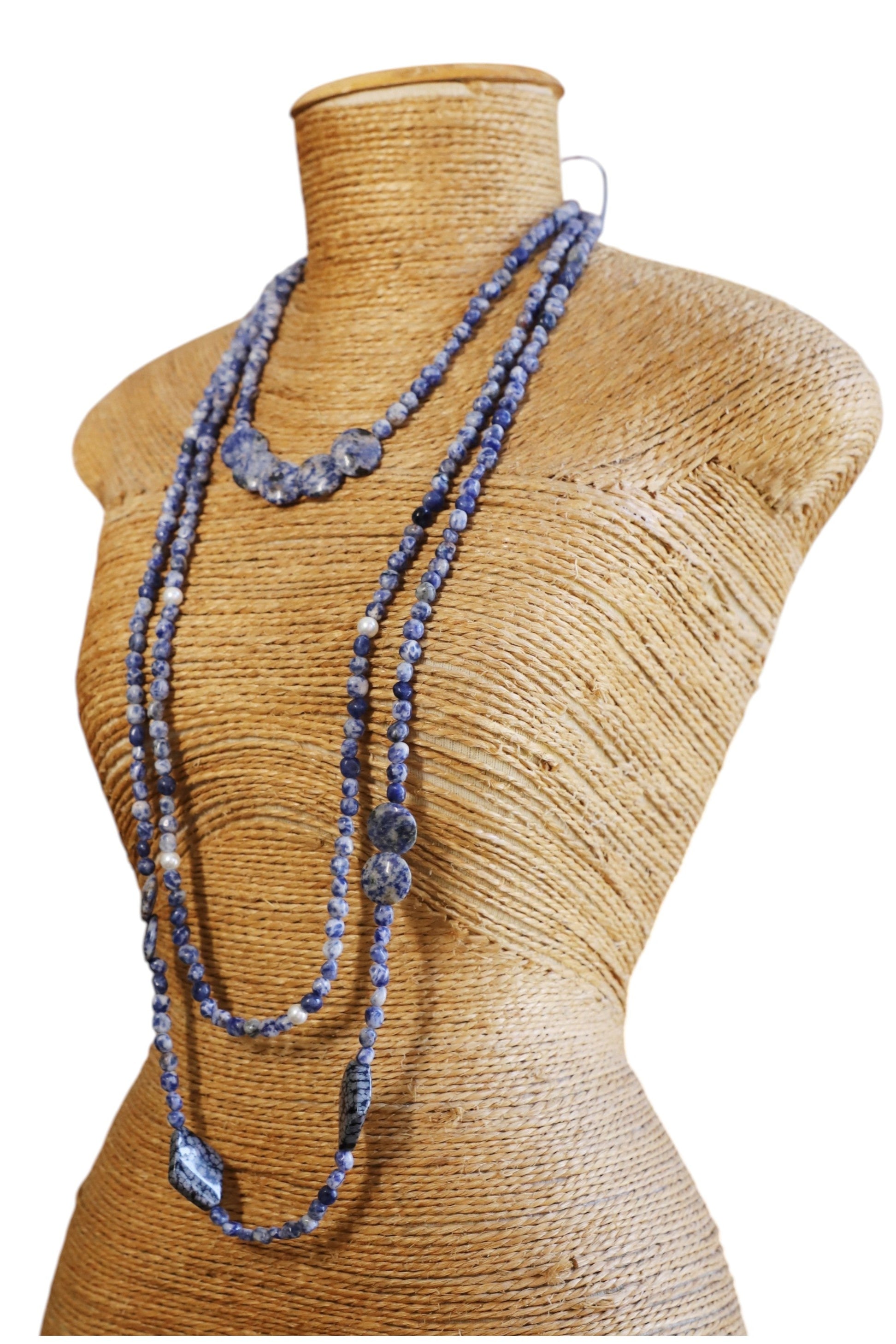 3 colares de pedra lápis lazuli redondas, chatas, retangulares e pérolas.