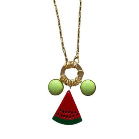 Patuá feito em corrente banho a ouro 72cm de fio a fio, com pingentes pendurados de melancia.