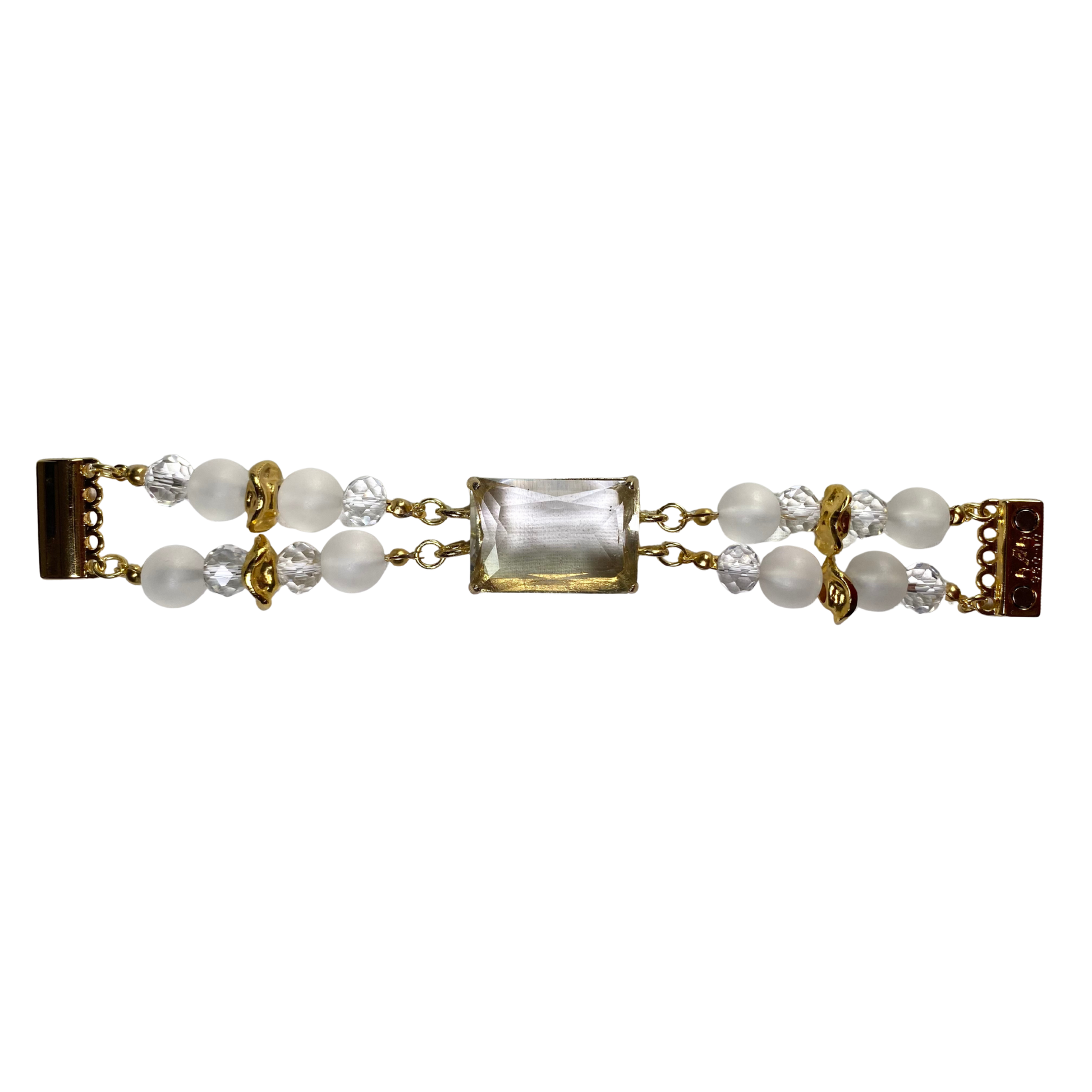 A Pulseira Cristal Lúmen possuí um cristal grande no centro, cristais Lalique, cristais facetados e entremeios em metal dourado. O fecho possuí imã. Comprimento em 18 cm.